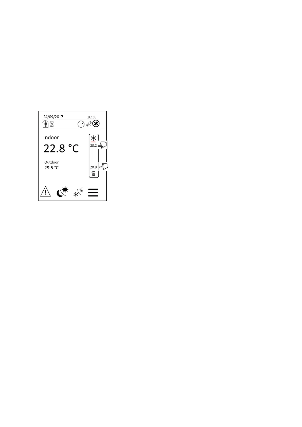 home screen by a touch on the value under snowflake (Cooling mode) or above heat (Heating mode). The setpoints