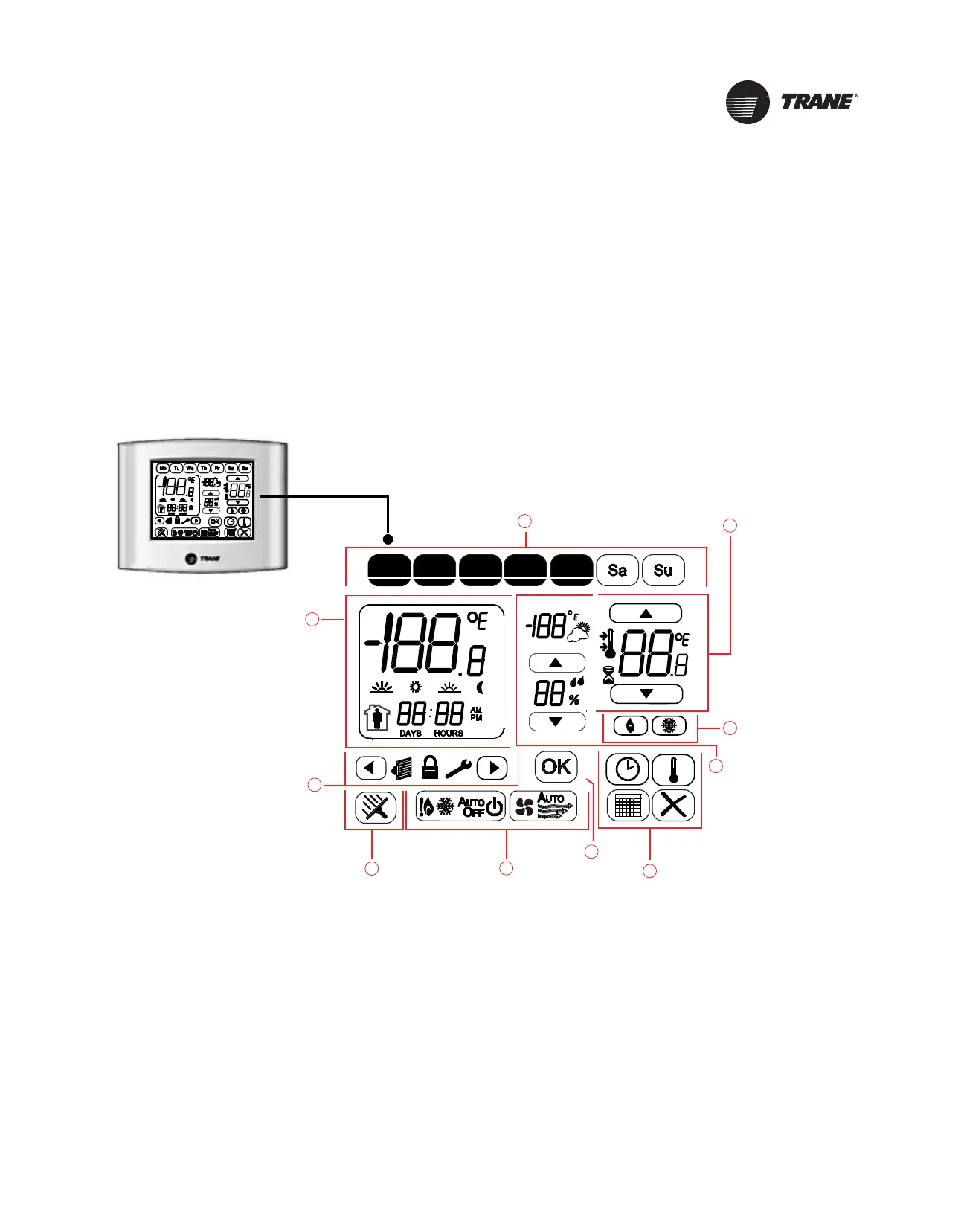 The illustration below provides a description of all icons for the thermostat. Bubbled letters in red