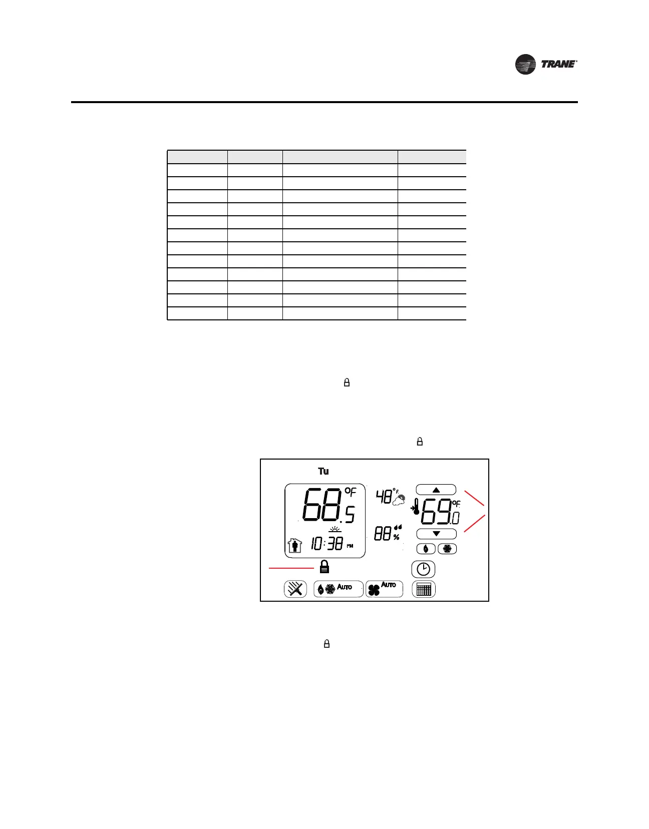 The thermostat can be locked out to prevent unauthorized personnel from changing settings. A