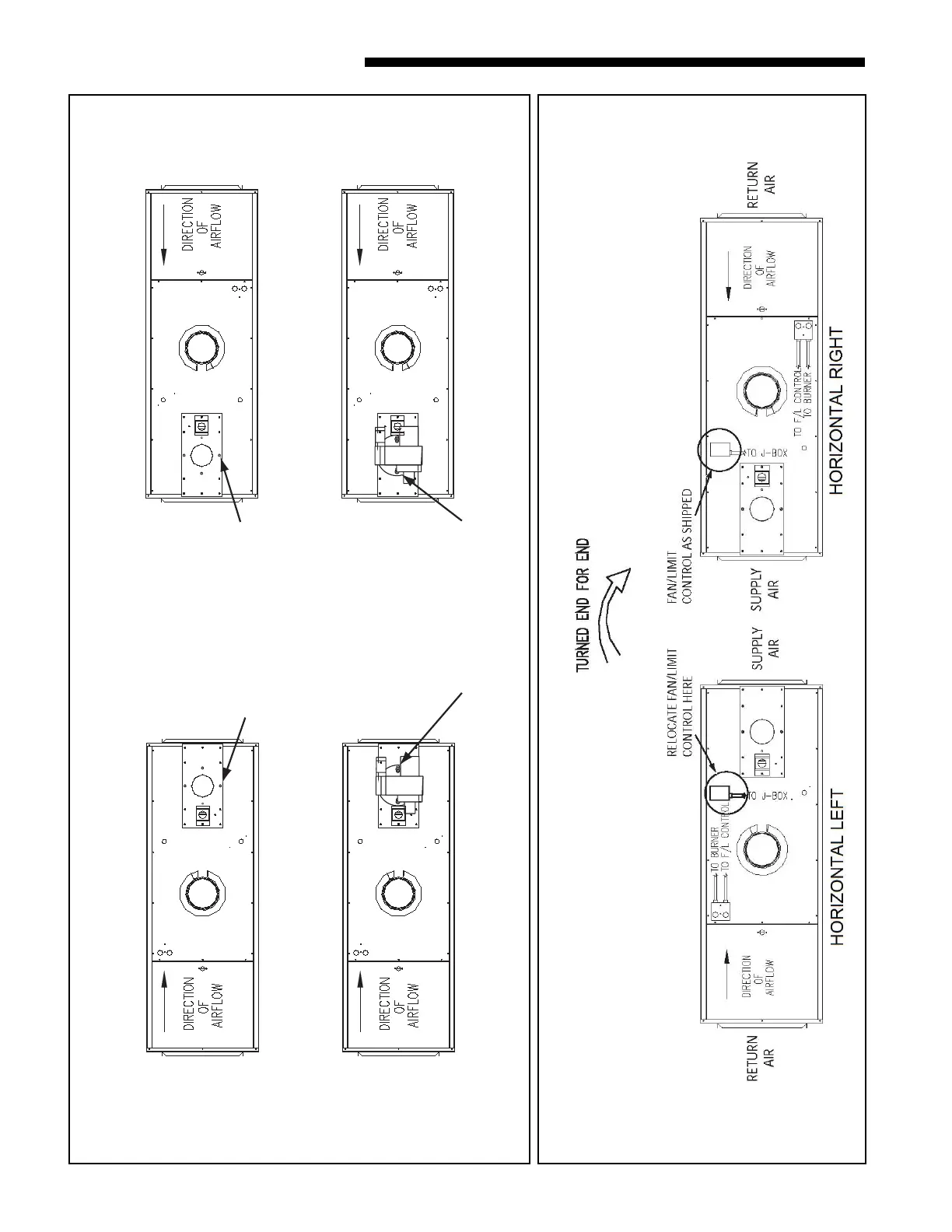 Correct locations for the fan/limit control for horizontal left/right furnace configuration