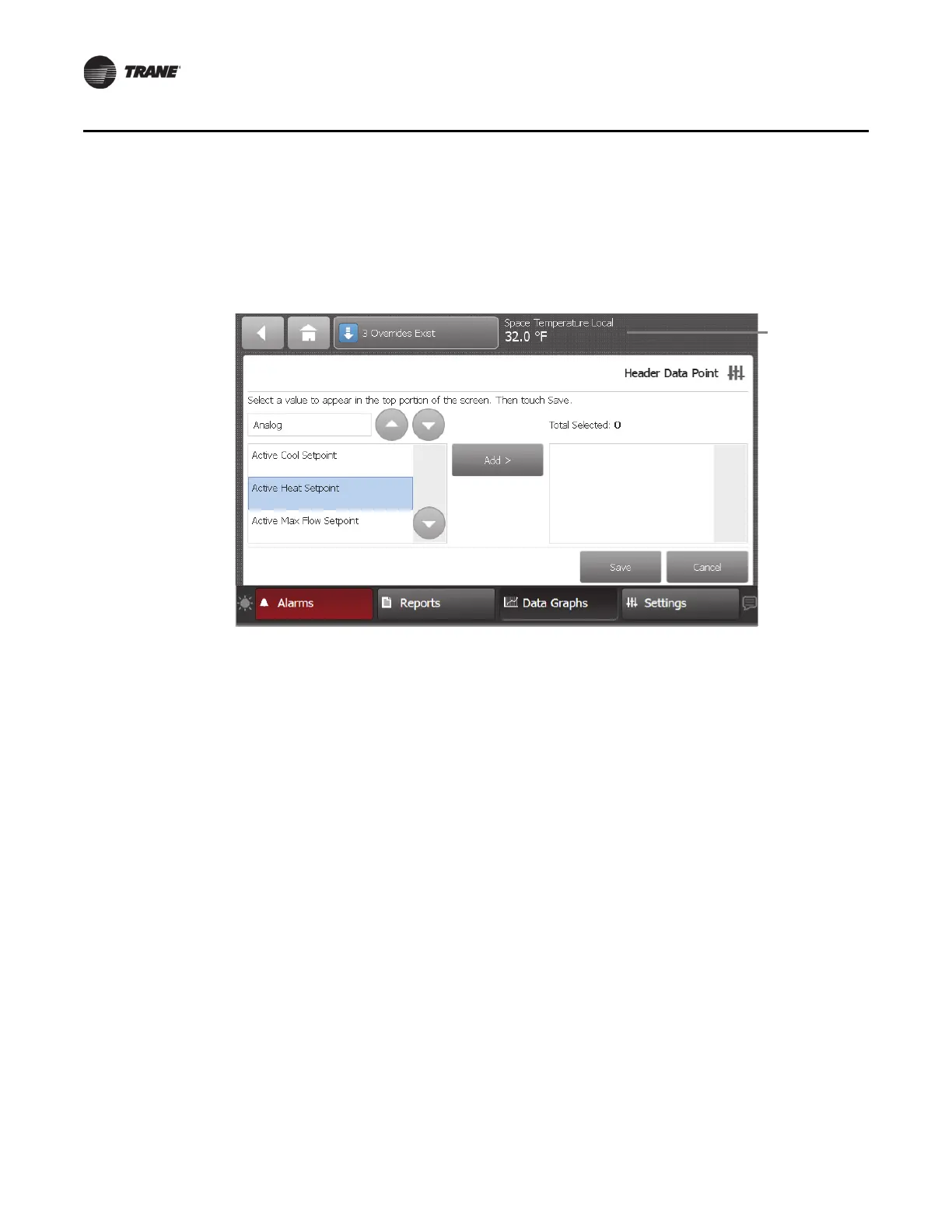 Report, Active Alarms, any of the three Custom Reports, or any custom graphic.