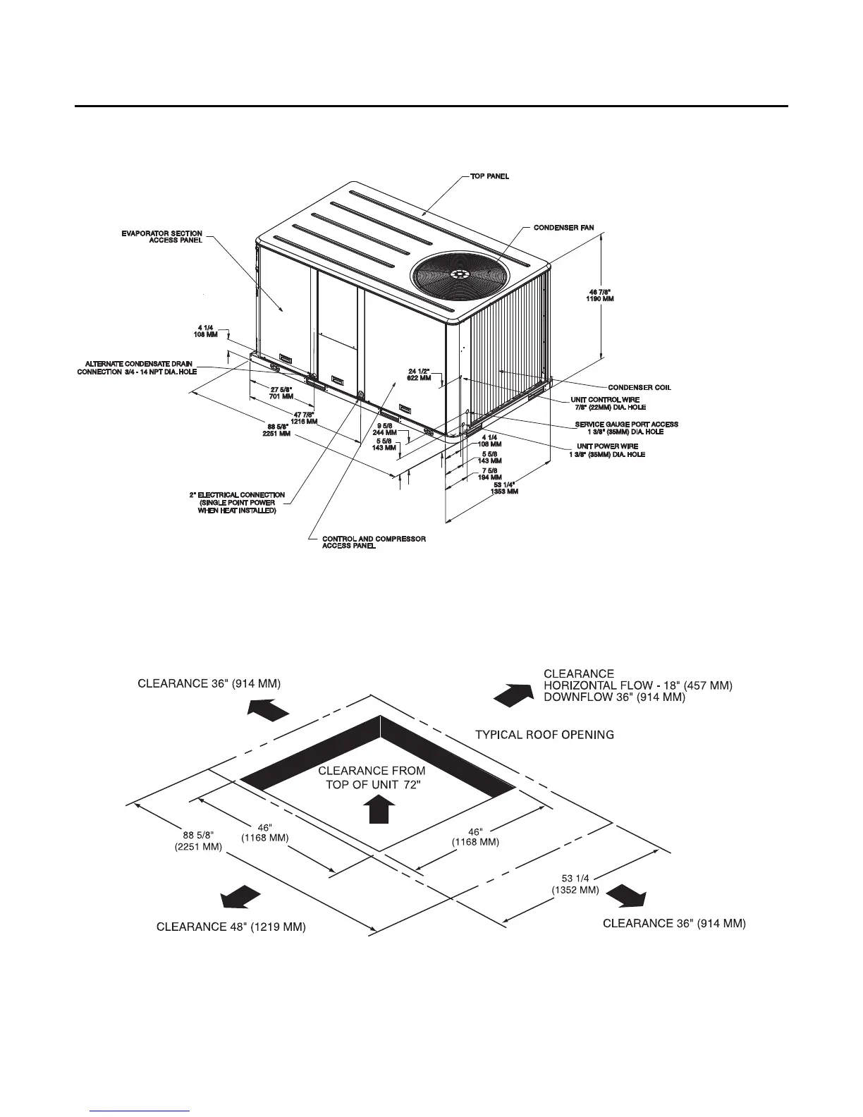 Figure 7. Heat pump - 5-7½ ton - unit clearance and roof opening