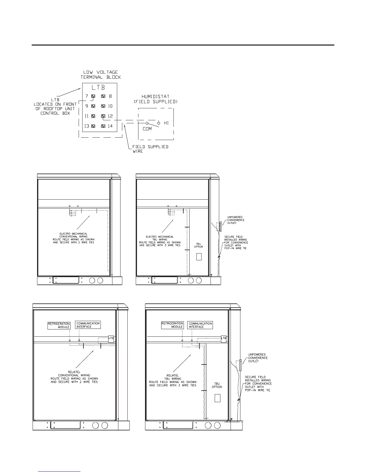 Figure 45. Electromechanical control customer low voltage routing (all units except 10 ton high efficiency)