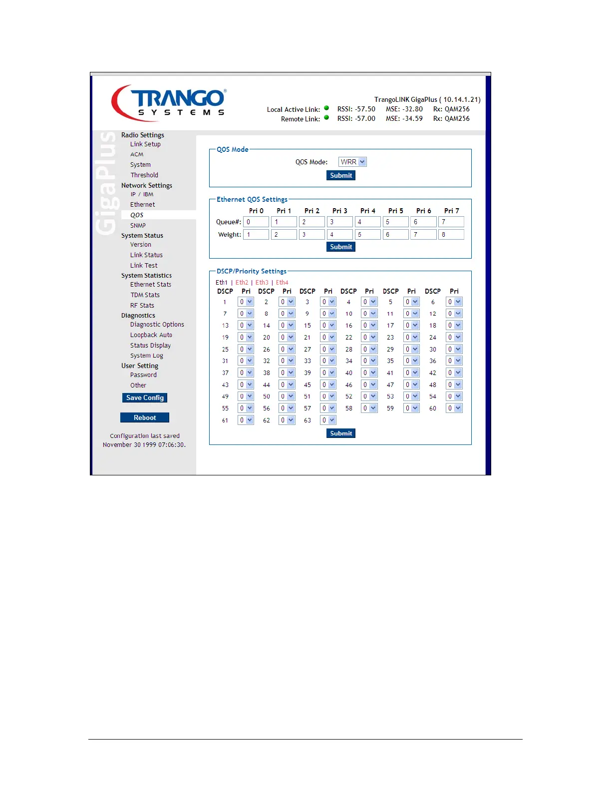 Trango Systems TrangoLINK GigaPlus - Figure 43 Qos Setup Page for WRR Mode