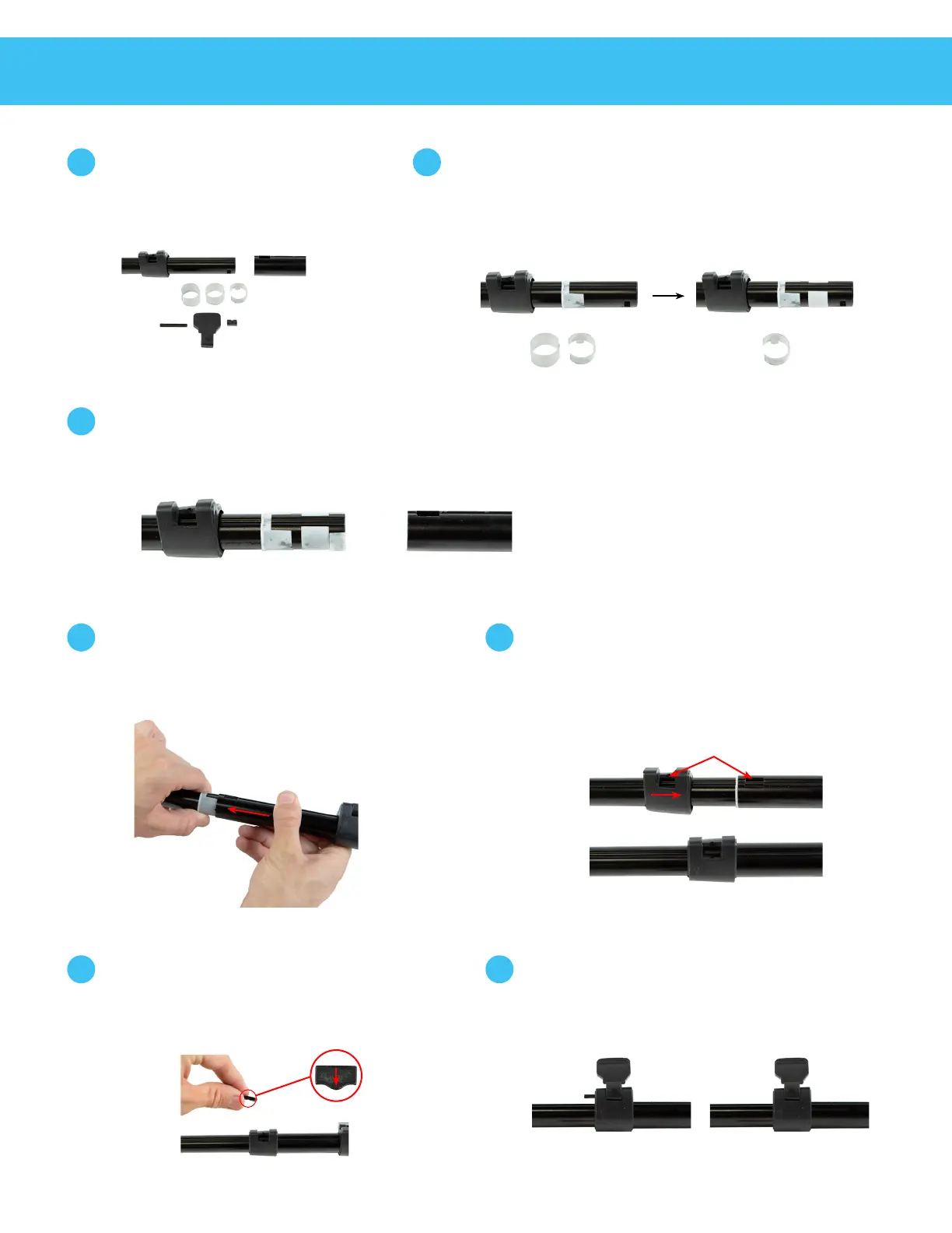 Attach the gray plastic clip to the smaller pole segment. There are two protruding