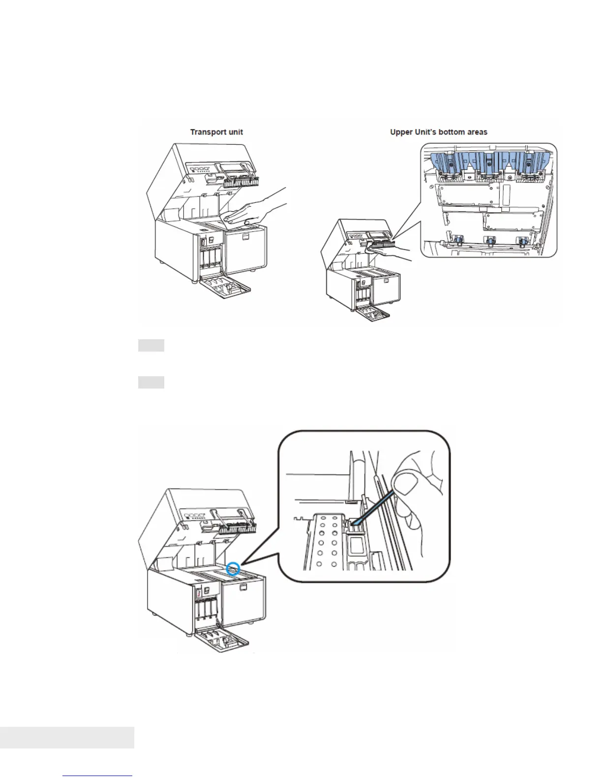 6. Wipe off ink, dust and paper dust adhered around transport and upper unit’s