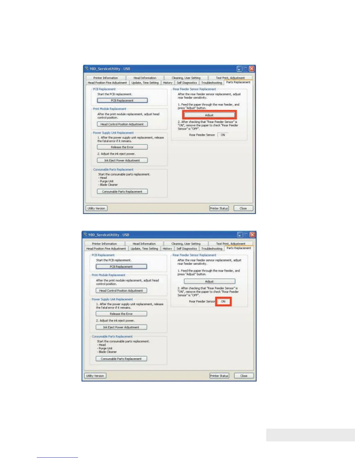 Open [Parts Replacement] tab, and then click [Adjust] to adjust Rear Feeder