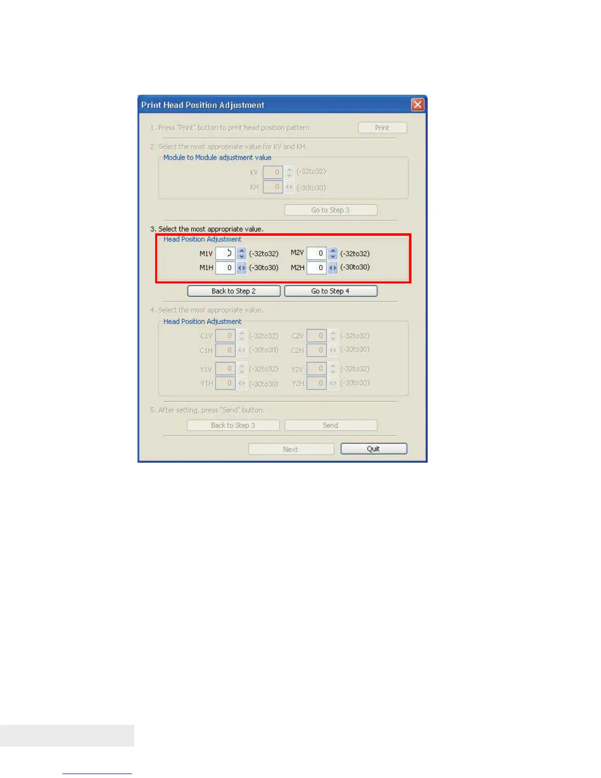 5) Enter the adjustment values in the Head Position Adjustment value entry