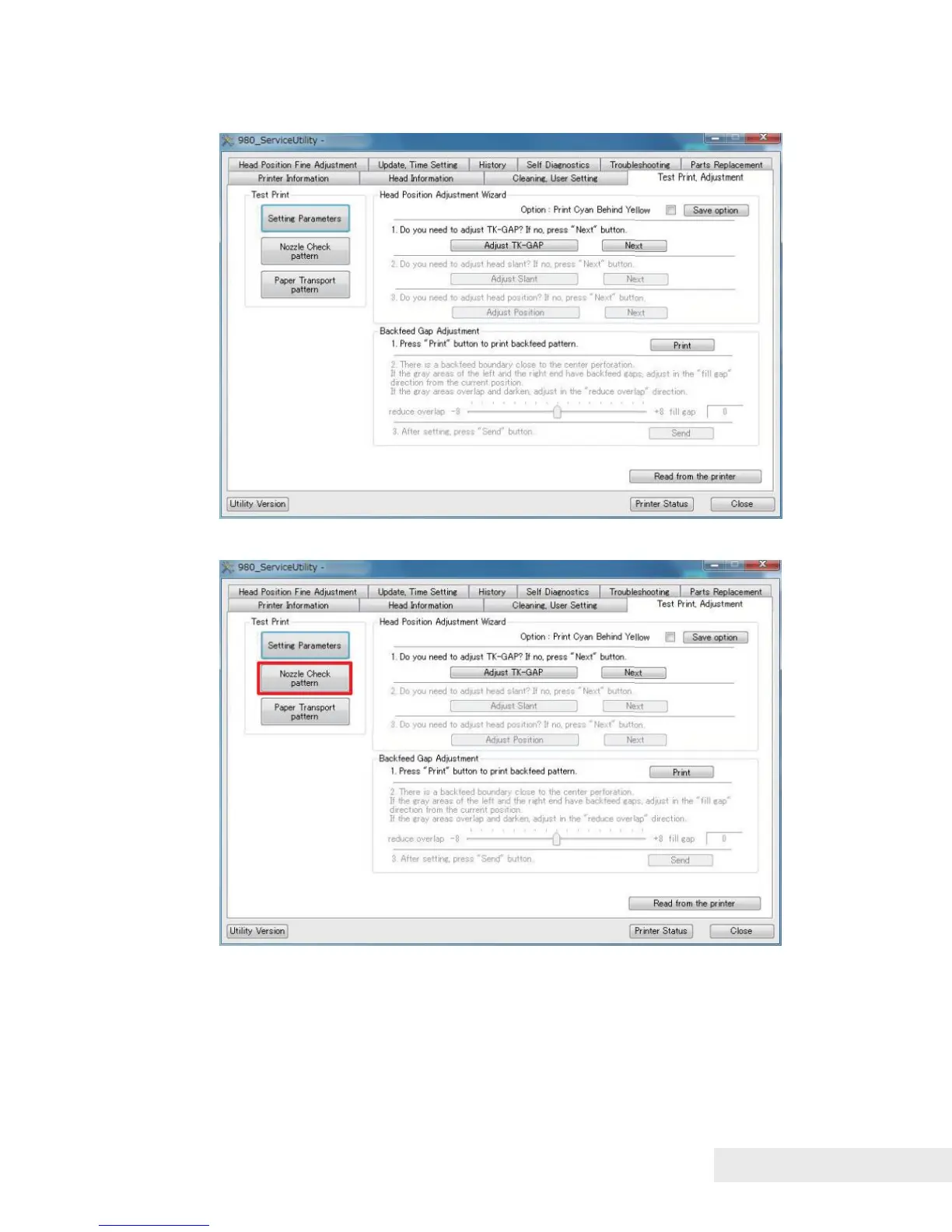 4) Open the [Test Print, Adjustment] tab of the "980 Service Utility" dialog box.