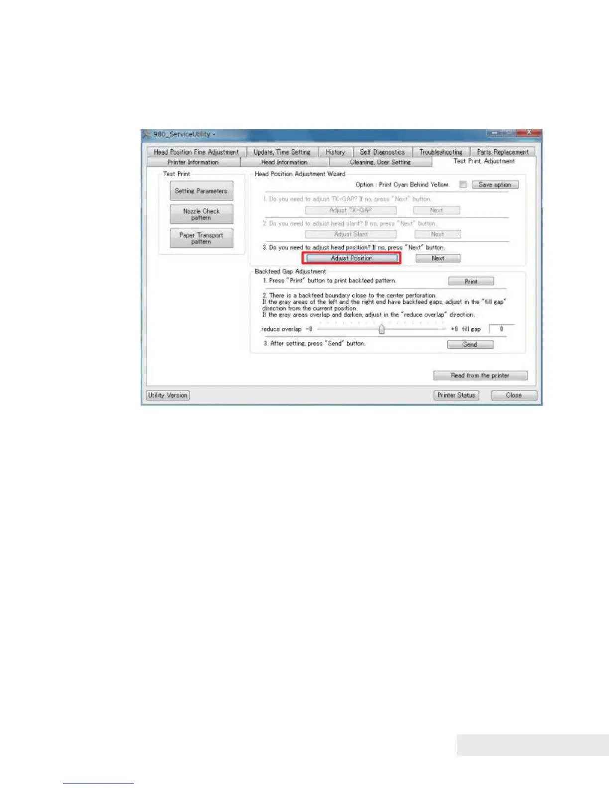 1) Open the [Test Print, Adjustment] tab and click [Adjust Position] to display