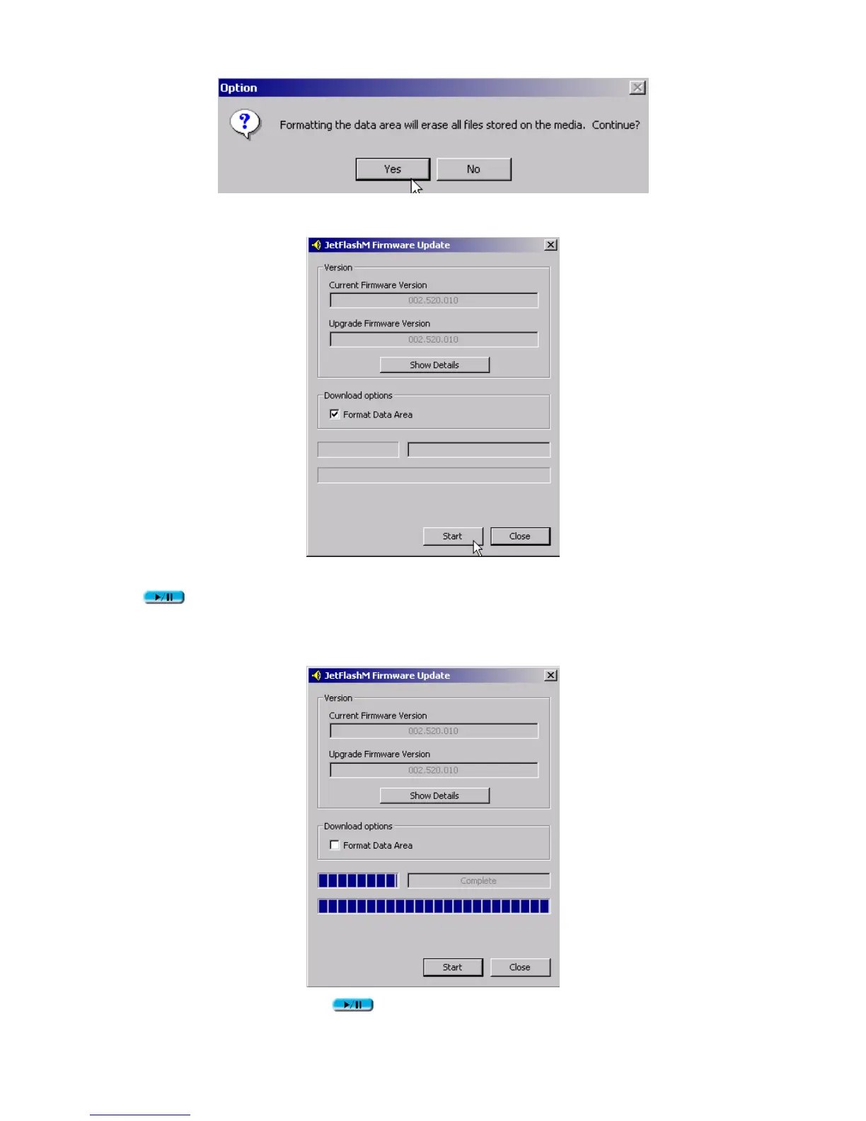 î If JetFlashM Firmware Update dialog does not appear, press and hold PLAY/PAUSE