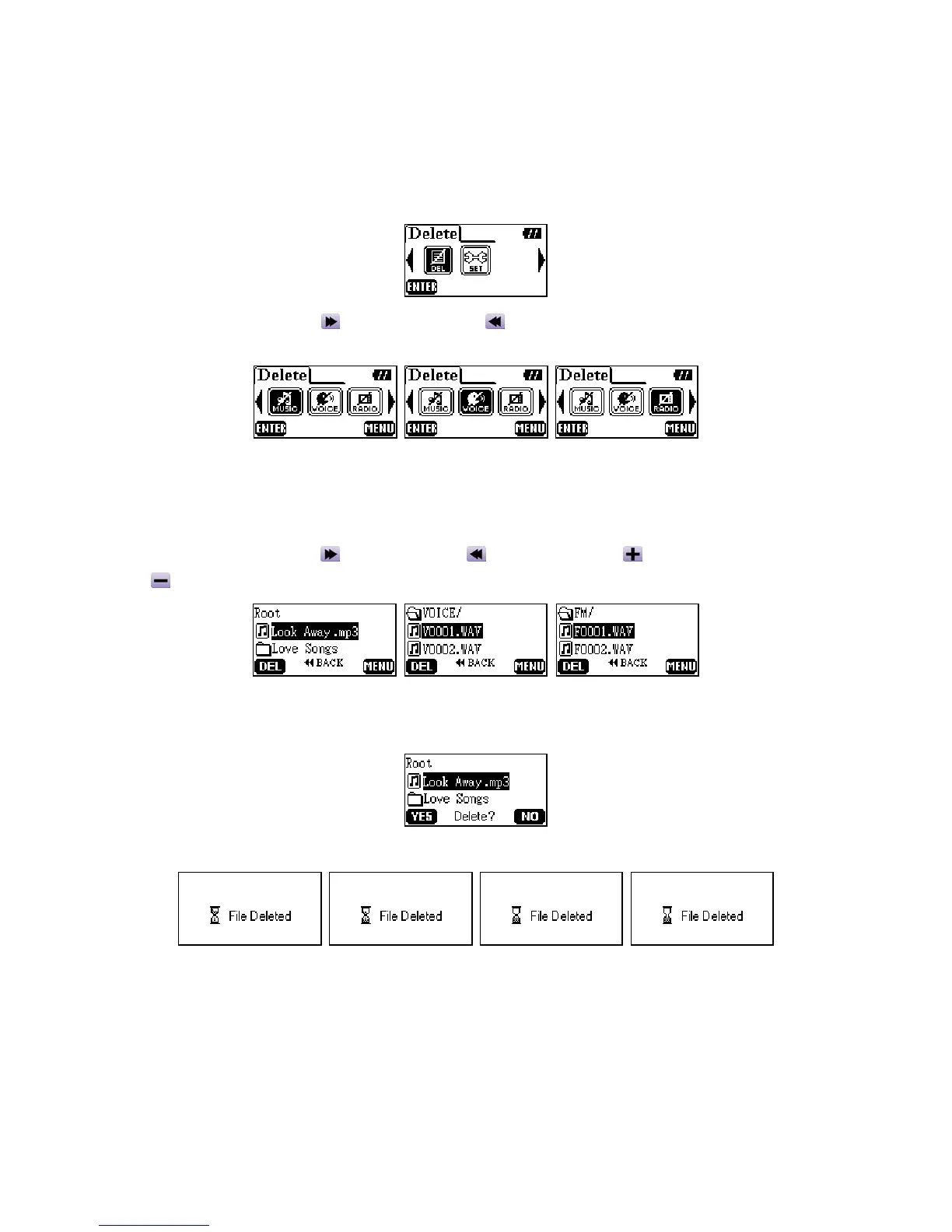button to select the file (MP3/WMA/WAV), and then press the PLAY button to delete it.