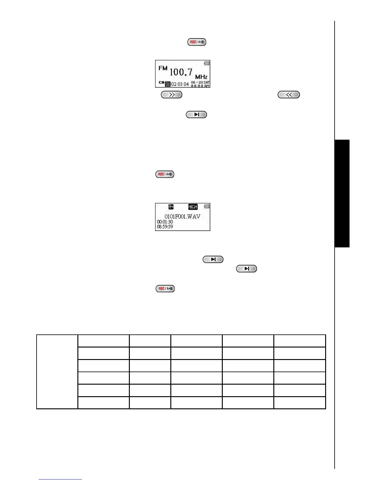 1. In the RADIO Mode press the “A-B/REC” button to display the channel numbers 1 to 20 on