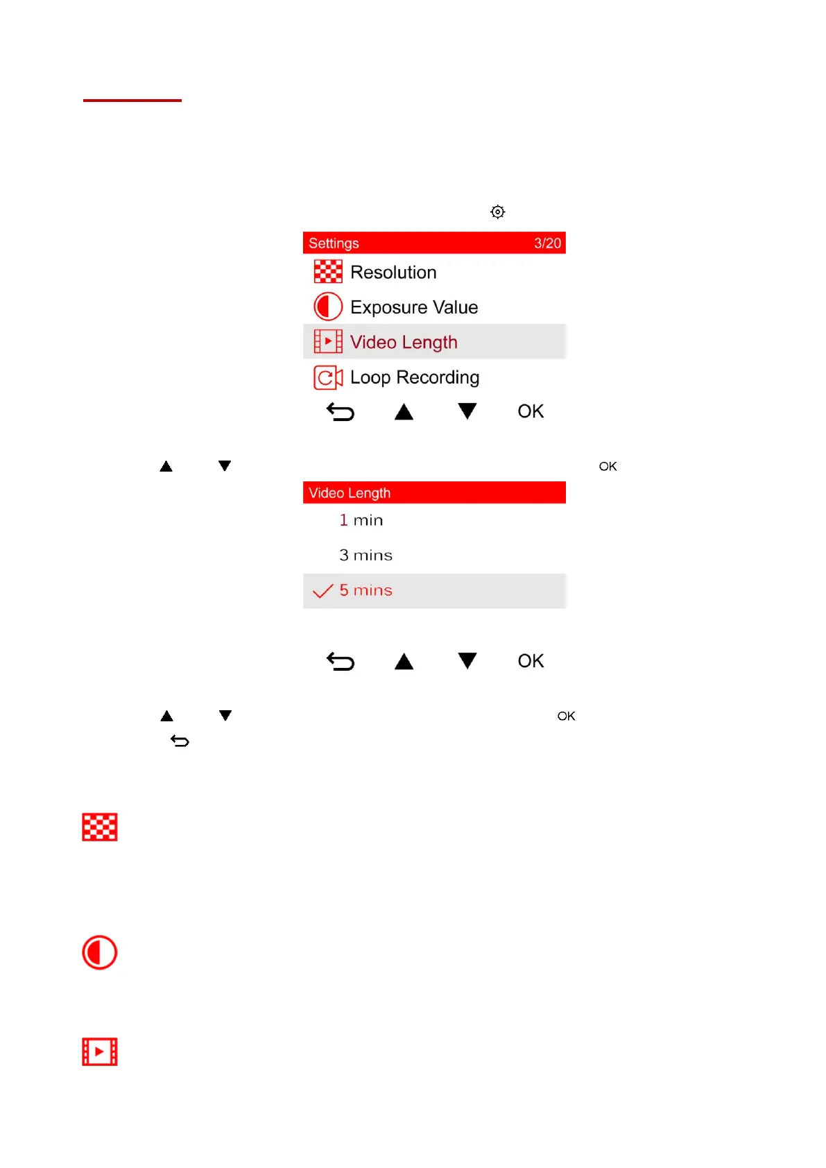 In the Settings menu, you can adjust settings of video resolution, recording time and G-Sensor