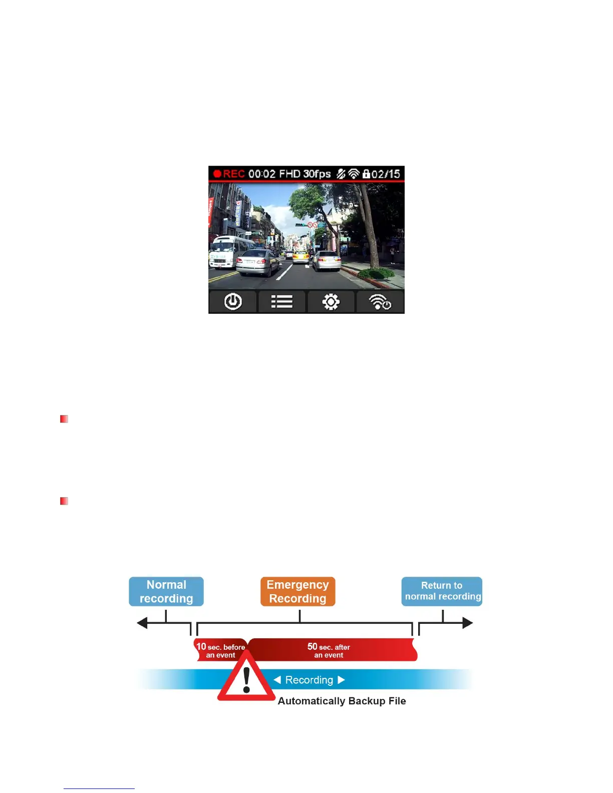 occurs (total 1 minute). The DrivePro can save up to 15 emergency video files. Video files recorded in