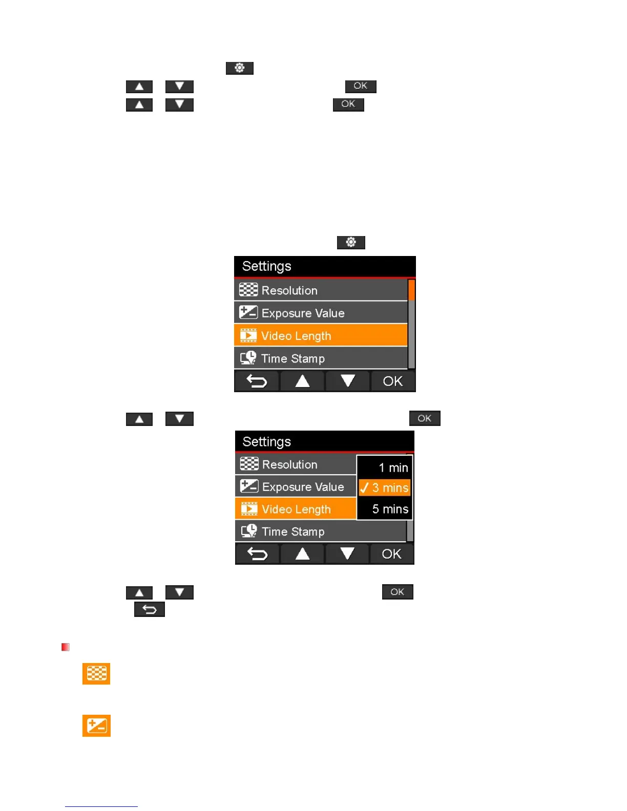In the Settings menu, you can adjust settings such as video resolution, recording time, and G-Sensor