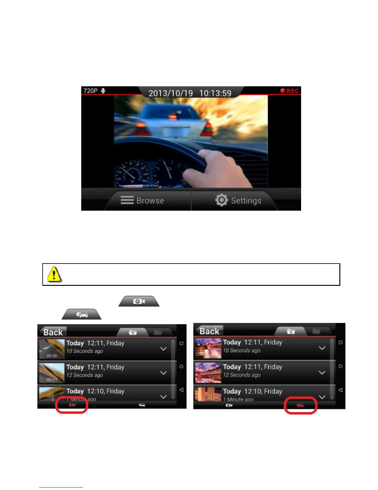 WARNING: After tapping Browse, the DrivePro will automatically stop recording. To resume