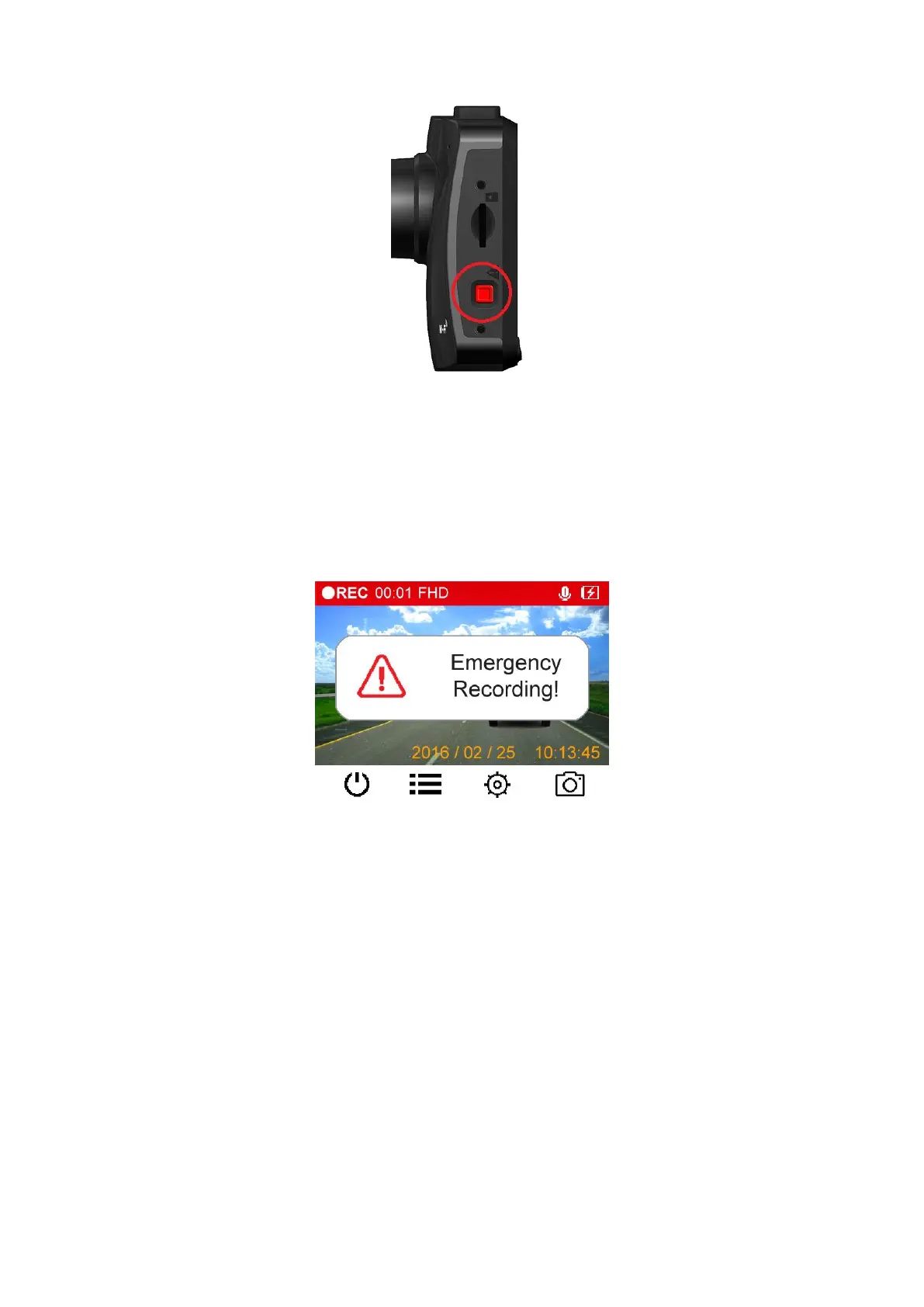 Manual Emergency Recording: During video recording, press the emergency button on the