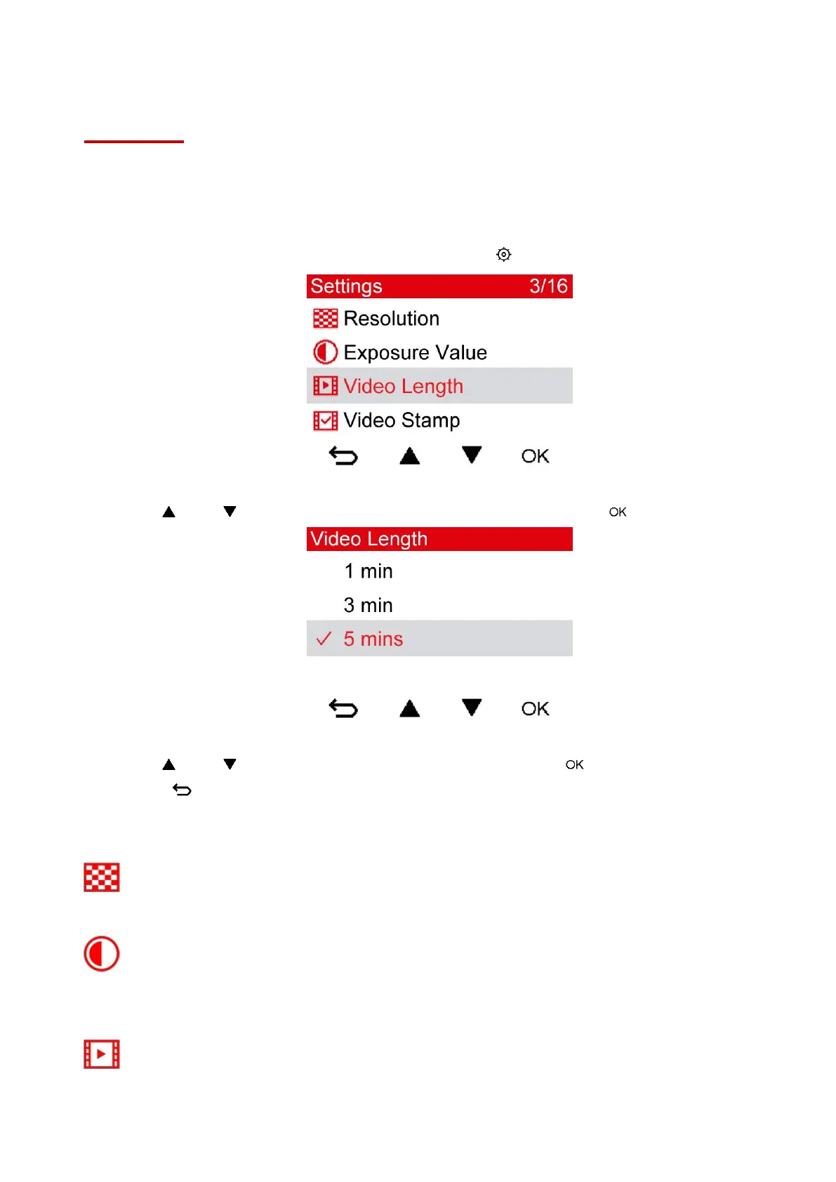 In the Settings menu, you can adjust settings of video resolution, recording time and G-Sensor