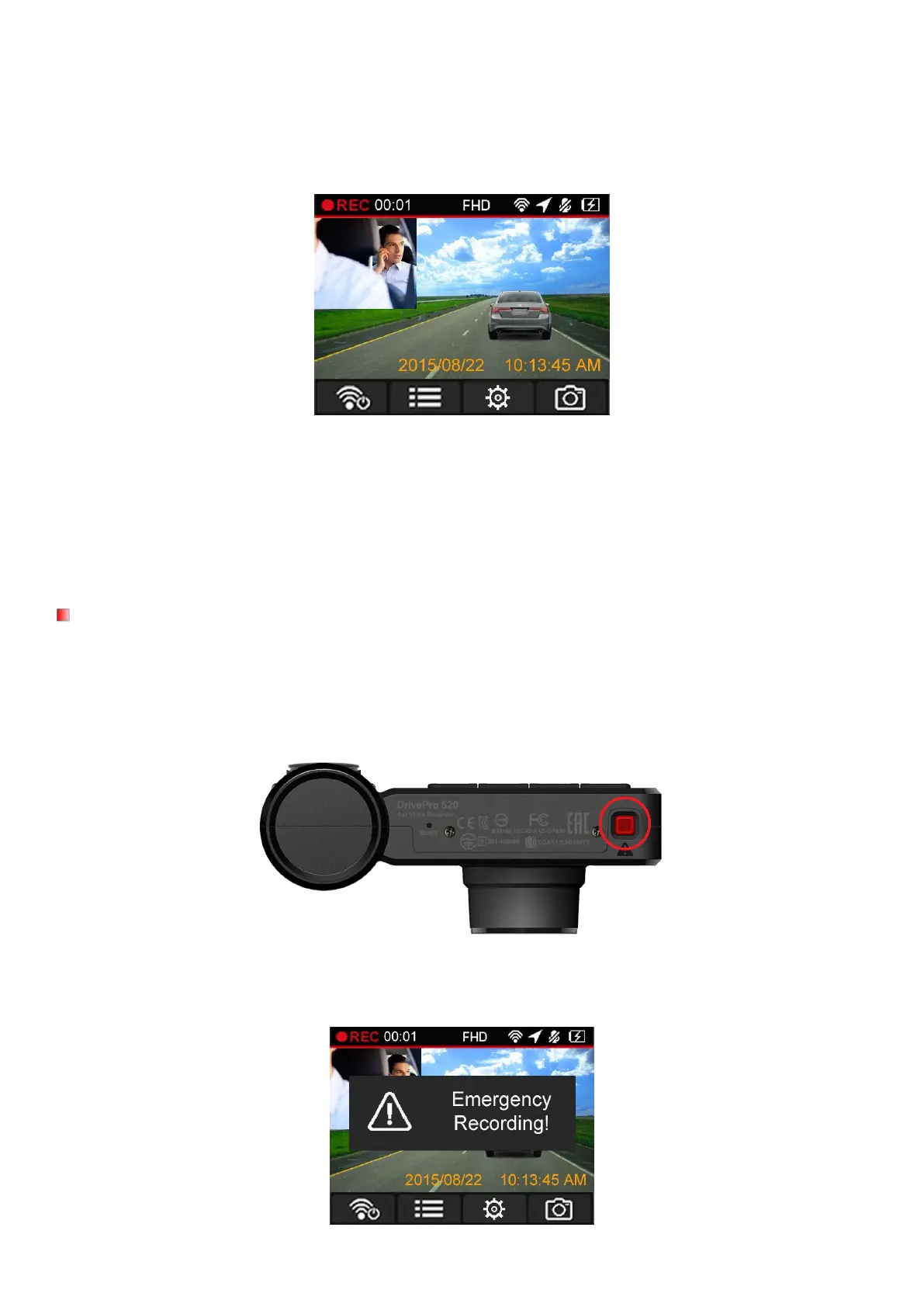 A warning will appear on the screen when the emergency recording is being activated.