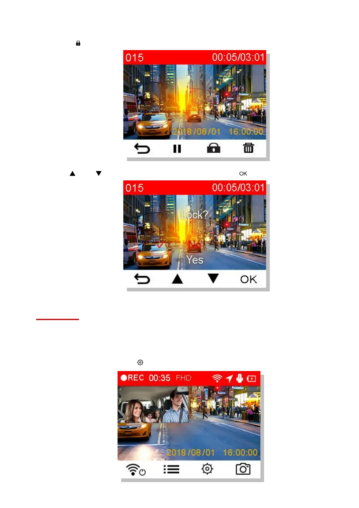 In the Settings menu, you can adjust settings of video resolution, recording time and G-Sensor