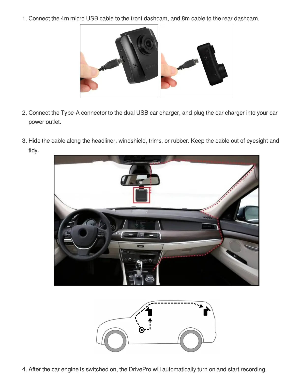 1. Connect the 4m micro USB cable to the front dashcam, and 8m cable to the rear dashcam.