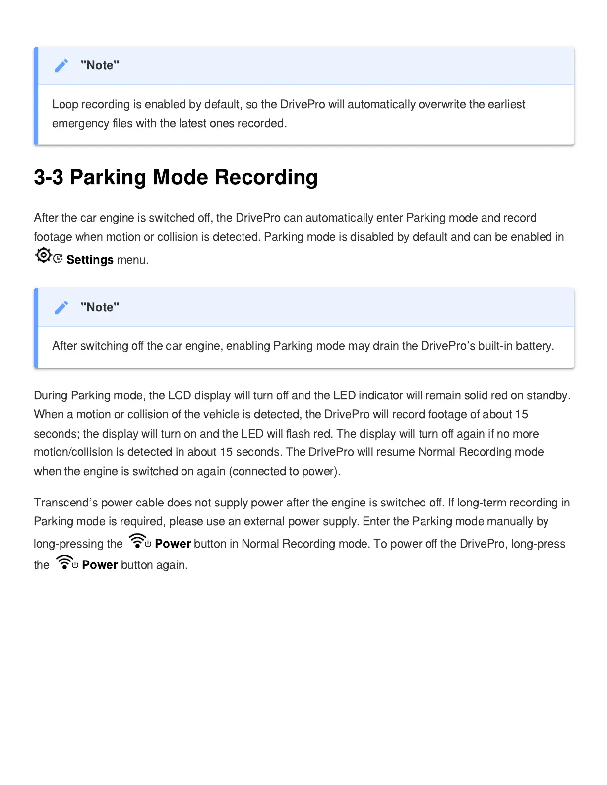 footage when motion or collision is detected. Parking mode is disabled by default and can be enabled in