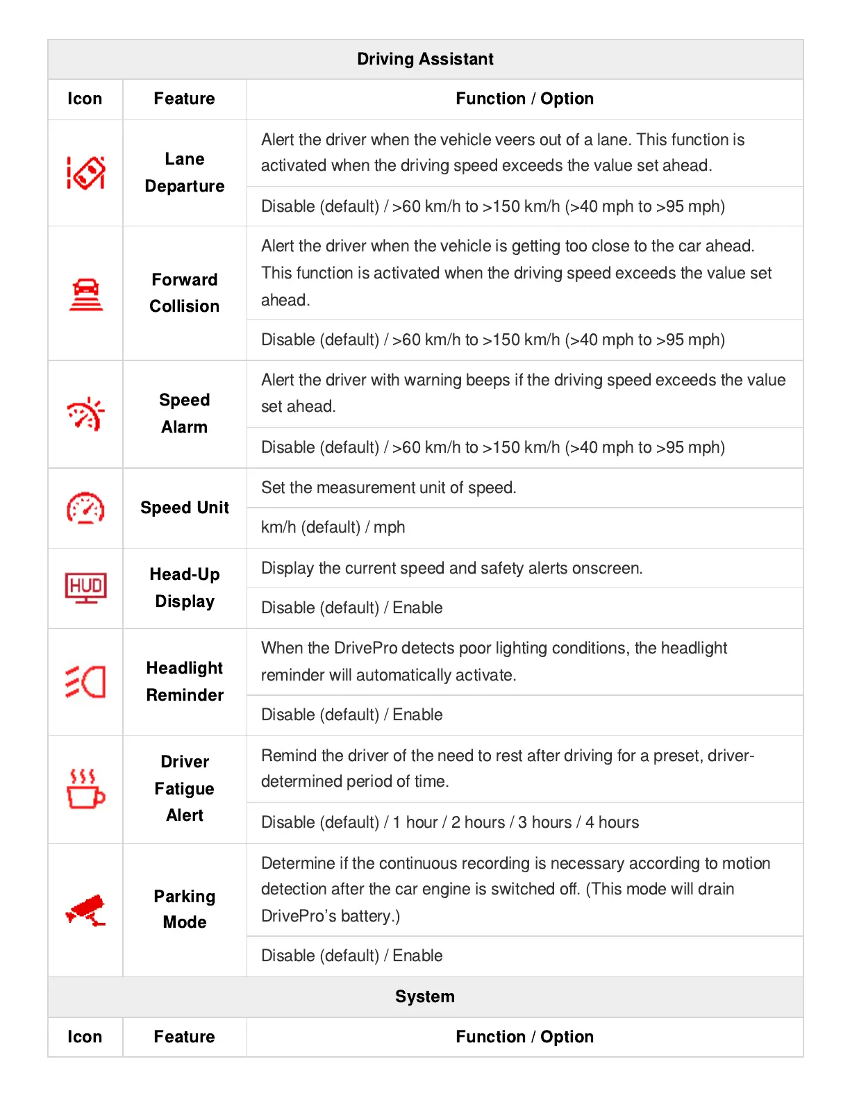 Disable (default) / >60 km/h to >150 km/h (>40 mph to >95 mph)