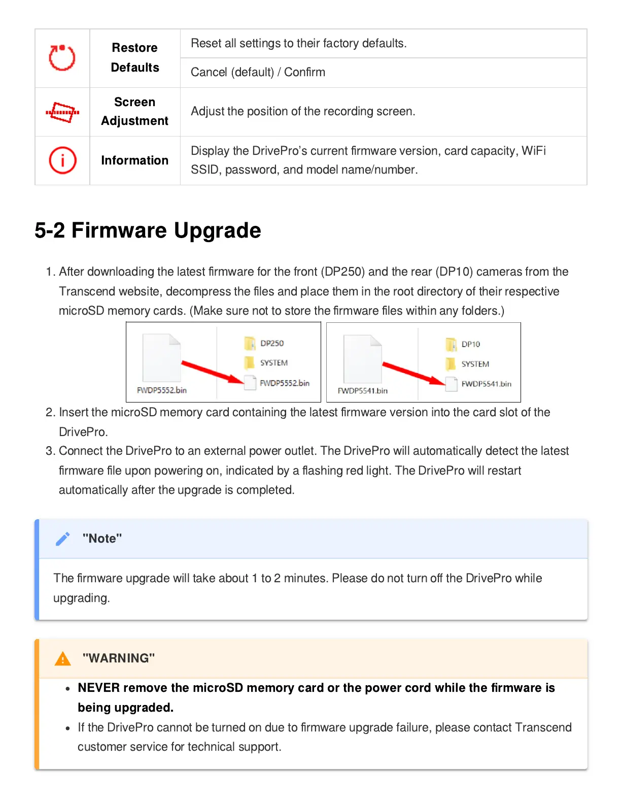 rmware for the front (DP250) and the rear (DP10) cameras from the