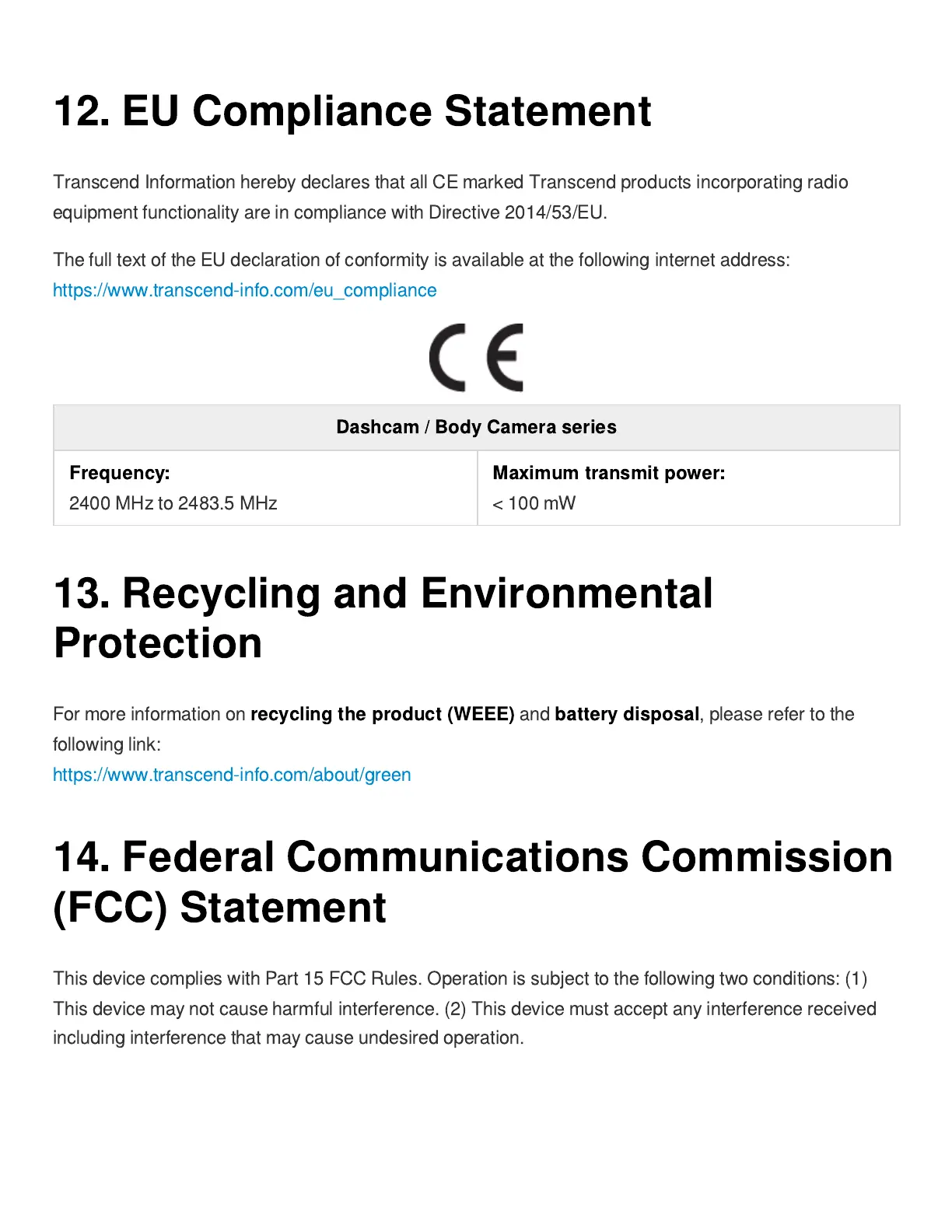 Transcend Information hereby declares that all CE marked Transcend products incorporating radio