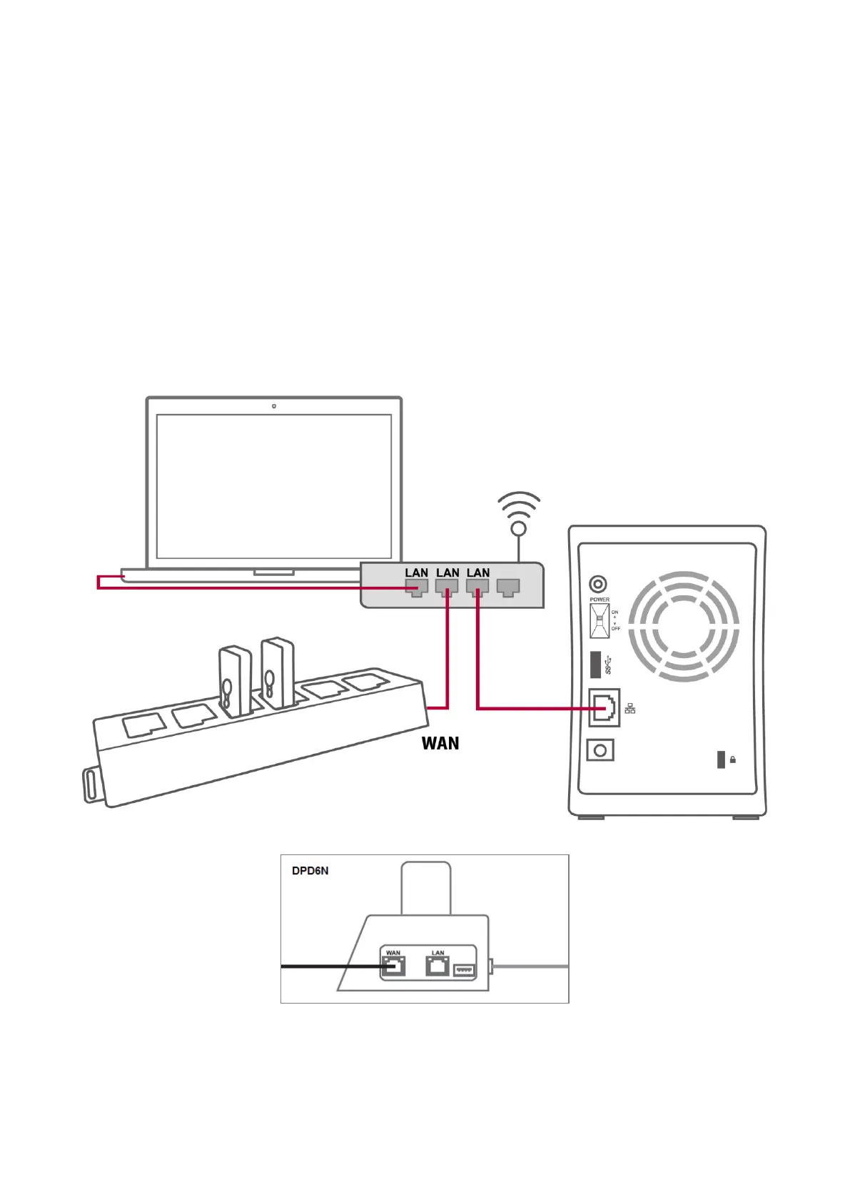 shown in the diagram below, connect your network switch or router to the WAN port of the