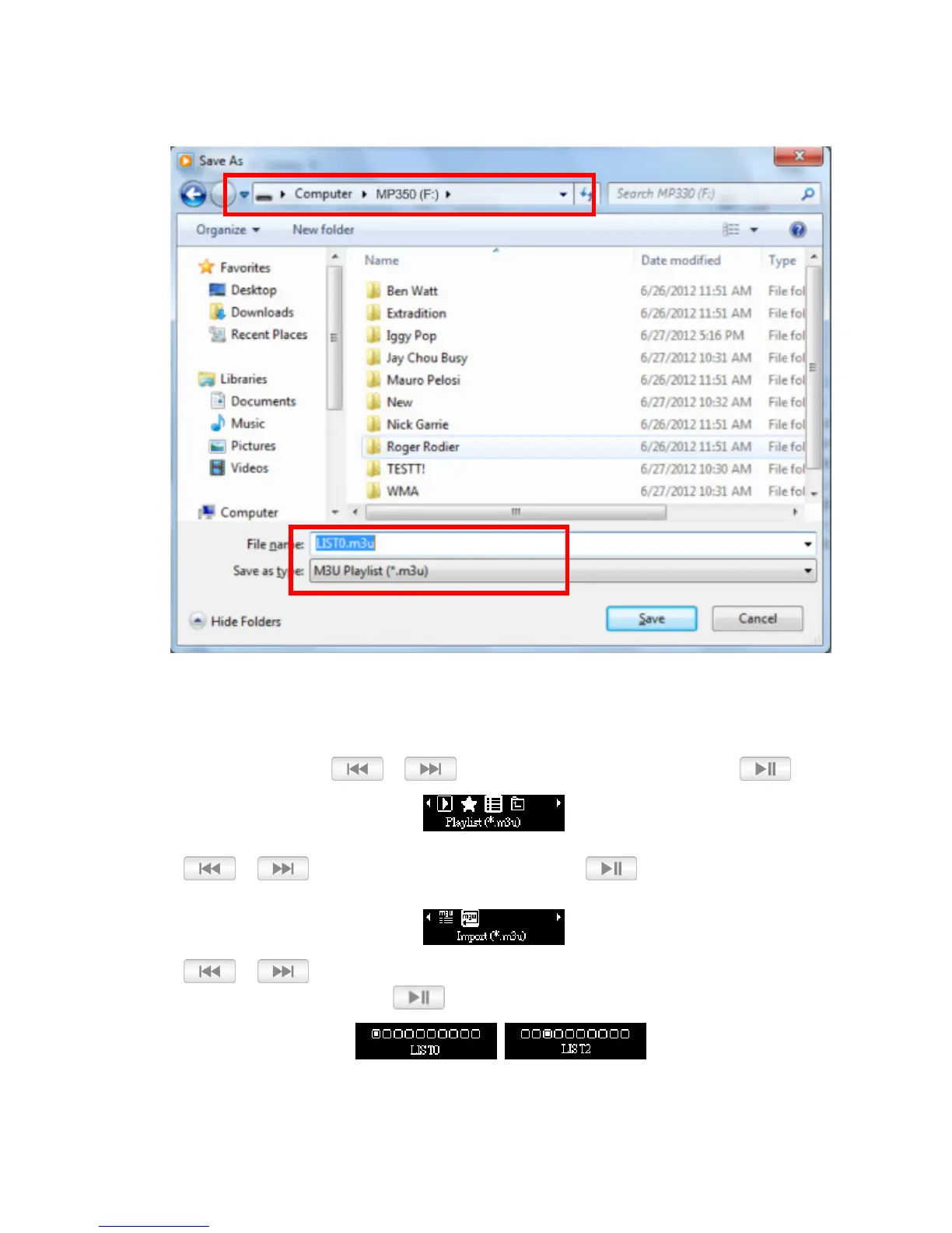 naming convention LIST0.m3u, LIST1.m3u, LIST2.m3u… LIST9.m3u, and save using the m3u file