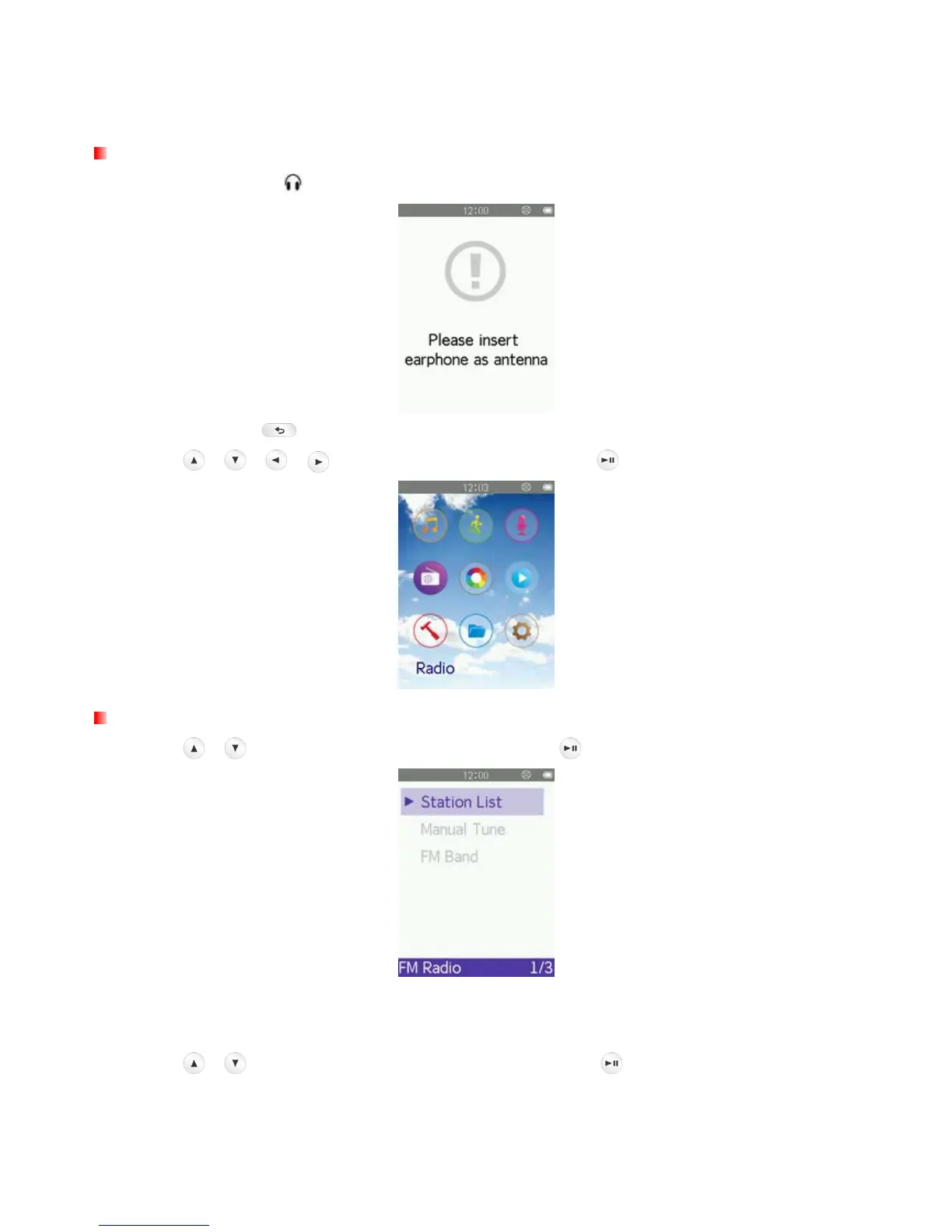 1. Plug in the earphones . (Earphones must be plugged-in to listen to the Radio).