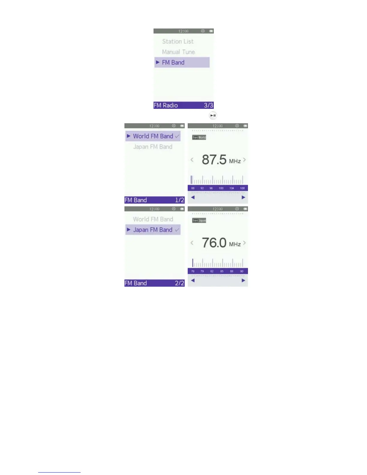 3. Select “World FM Band” or “Japan FM Band,” then press to confirm.