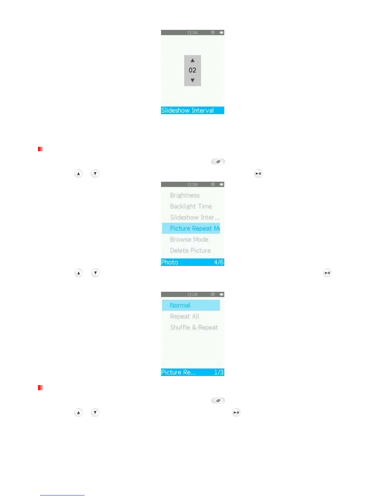 / buttons to select “Normal”, “Repeat All” or “Shuffle & Repeat” and press , then