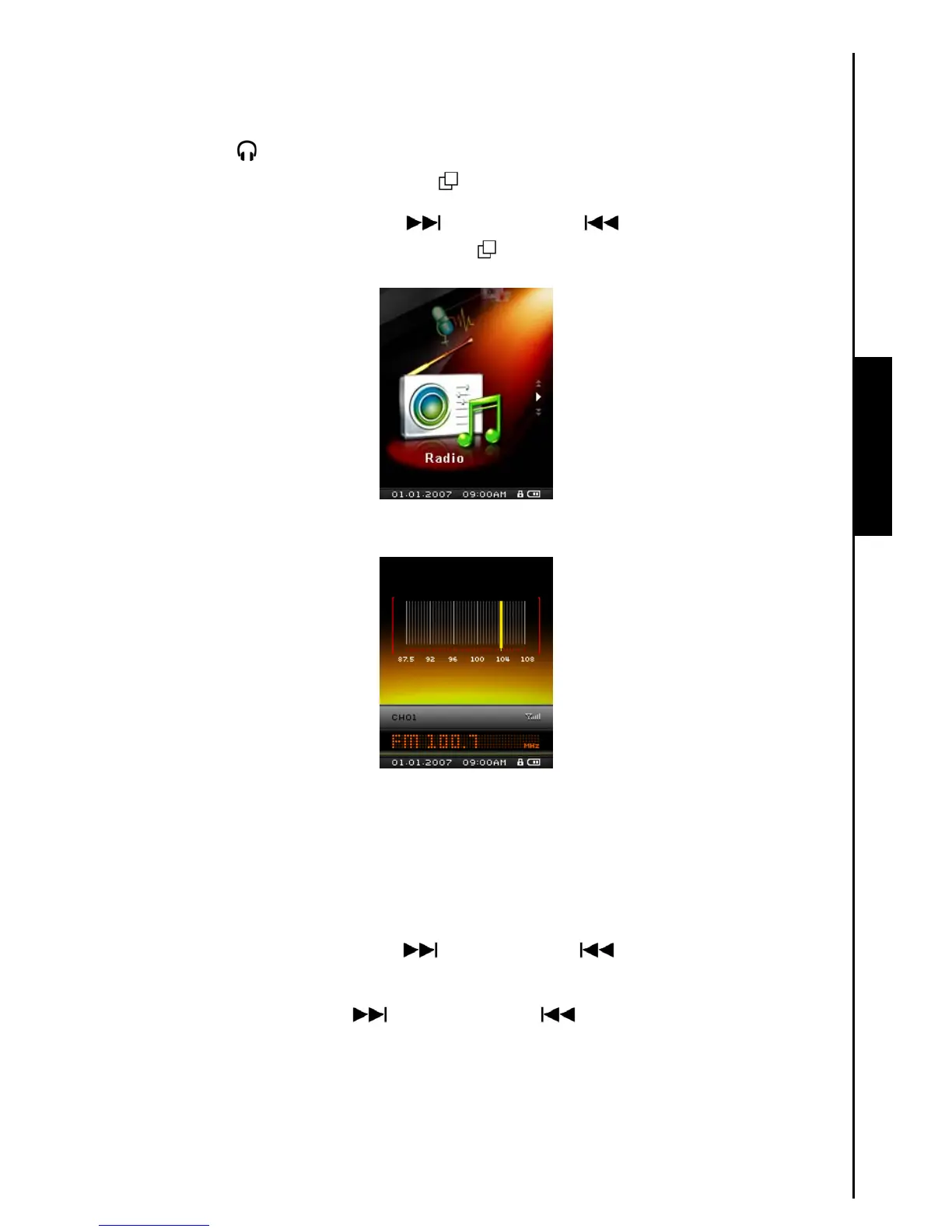 1. The Earphones must be plugged in to listen to the Radio.