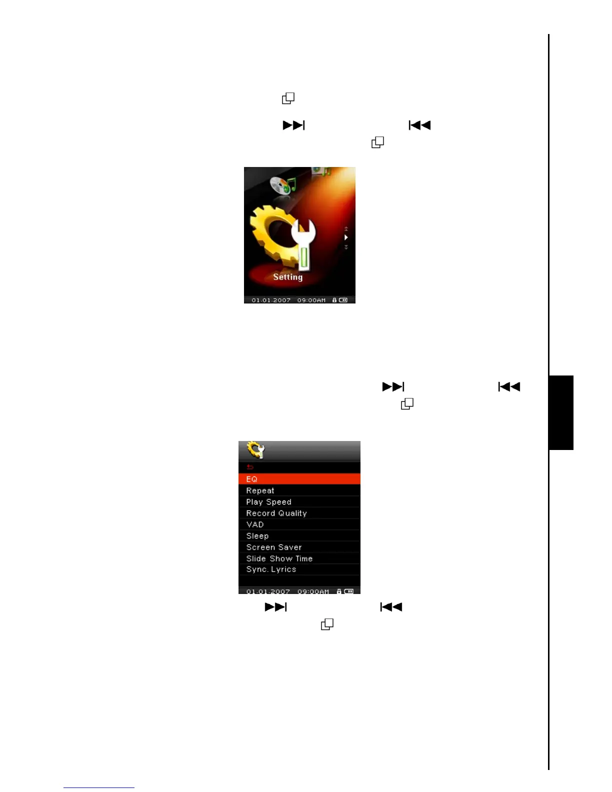 SETTINGS Menu. You will immediately hear the different sound effect in your earphones.