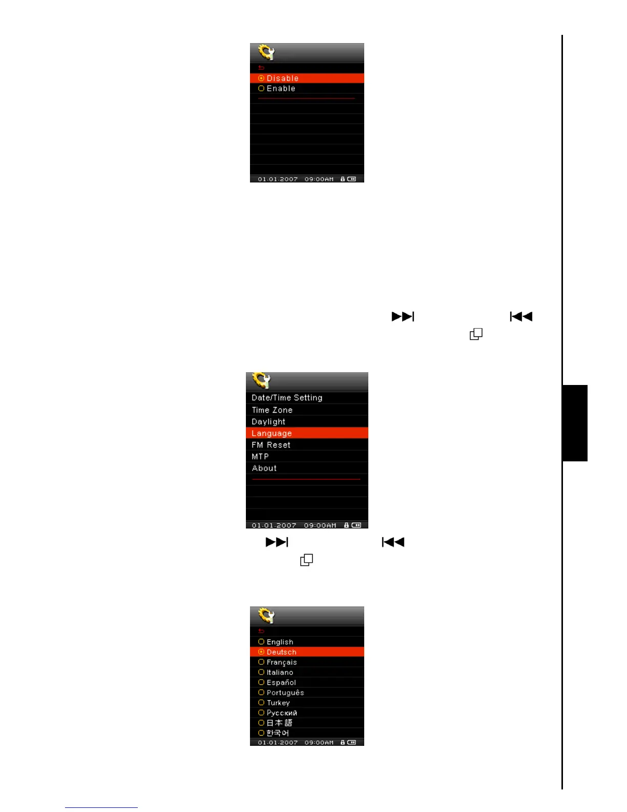 Sets the MP840’s User language, including the display of song and artist titles. The player supports 13