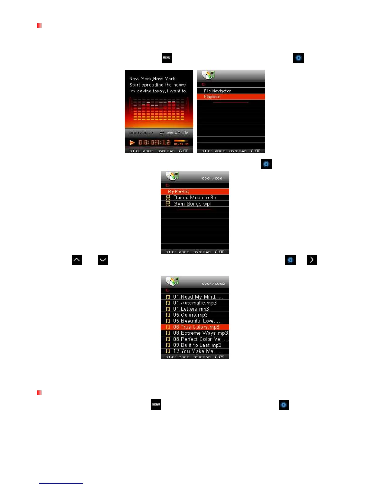 1. In the MUSIC mode, press and hold the button, then highlight Playlists and press .