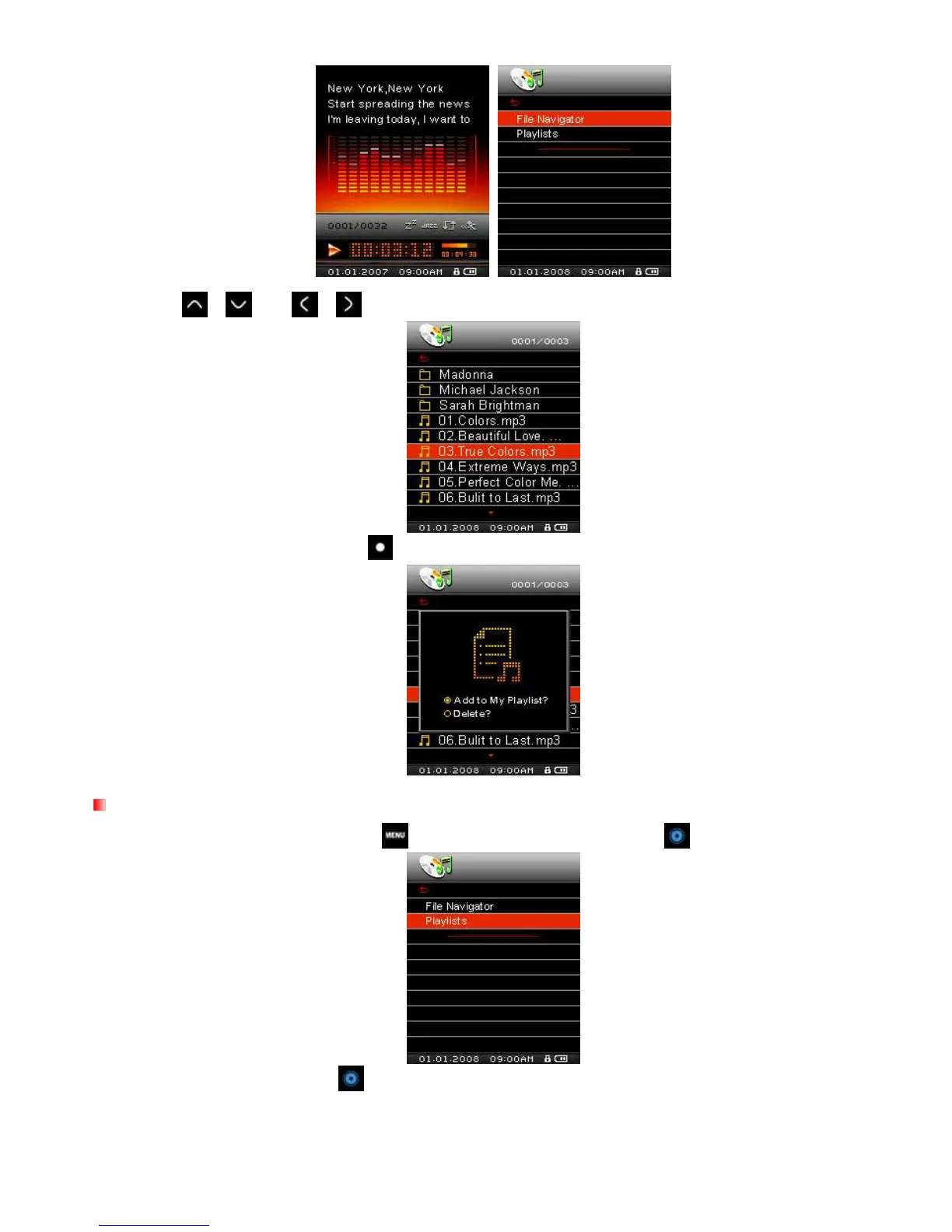1. In the MUSIC mode, press and hold , then highlight Playlists and press .