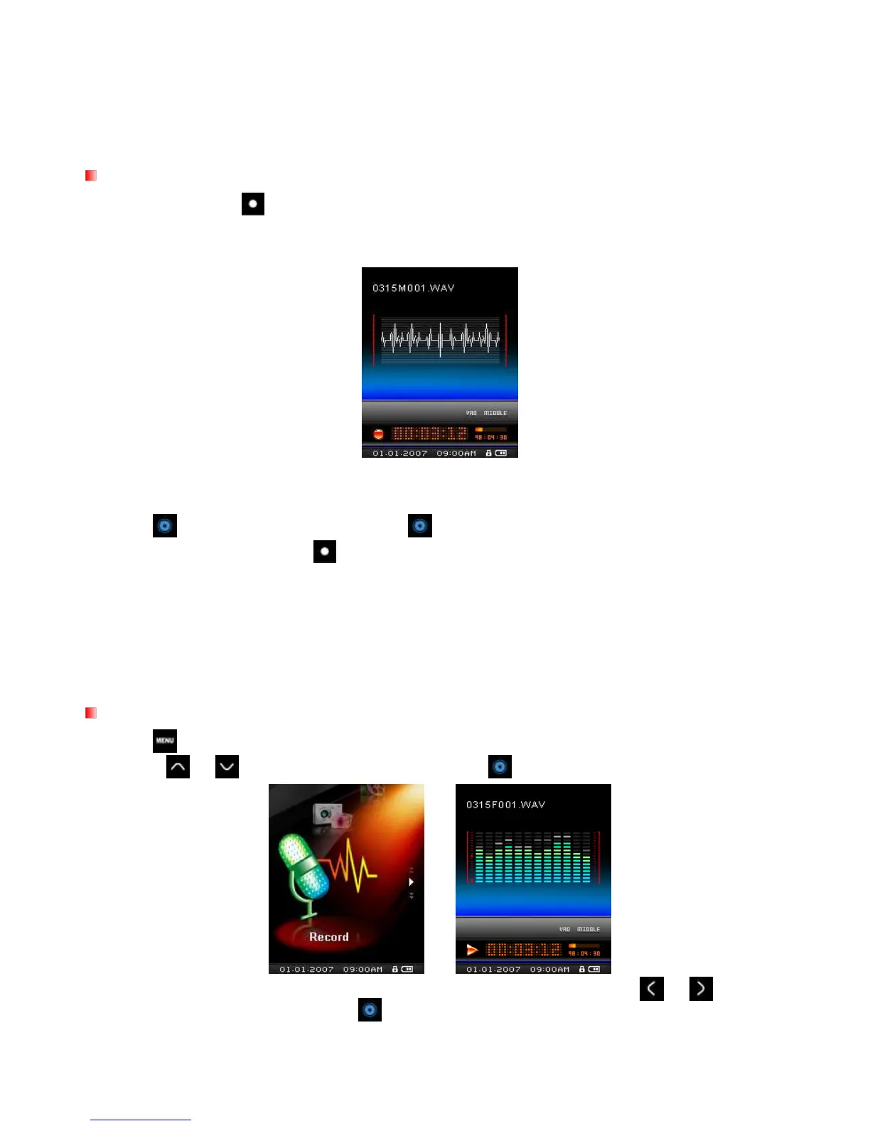 3. All voice and FM radio recordings can be found in the RECORD mode. Use the or buttons to