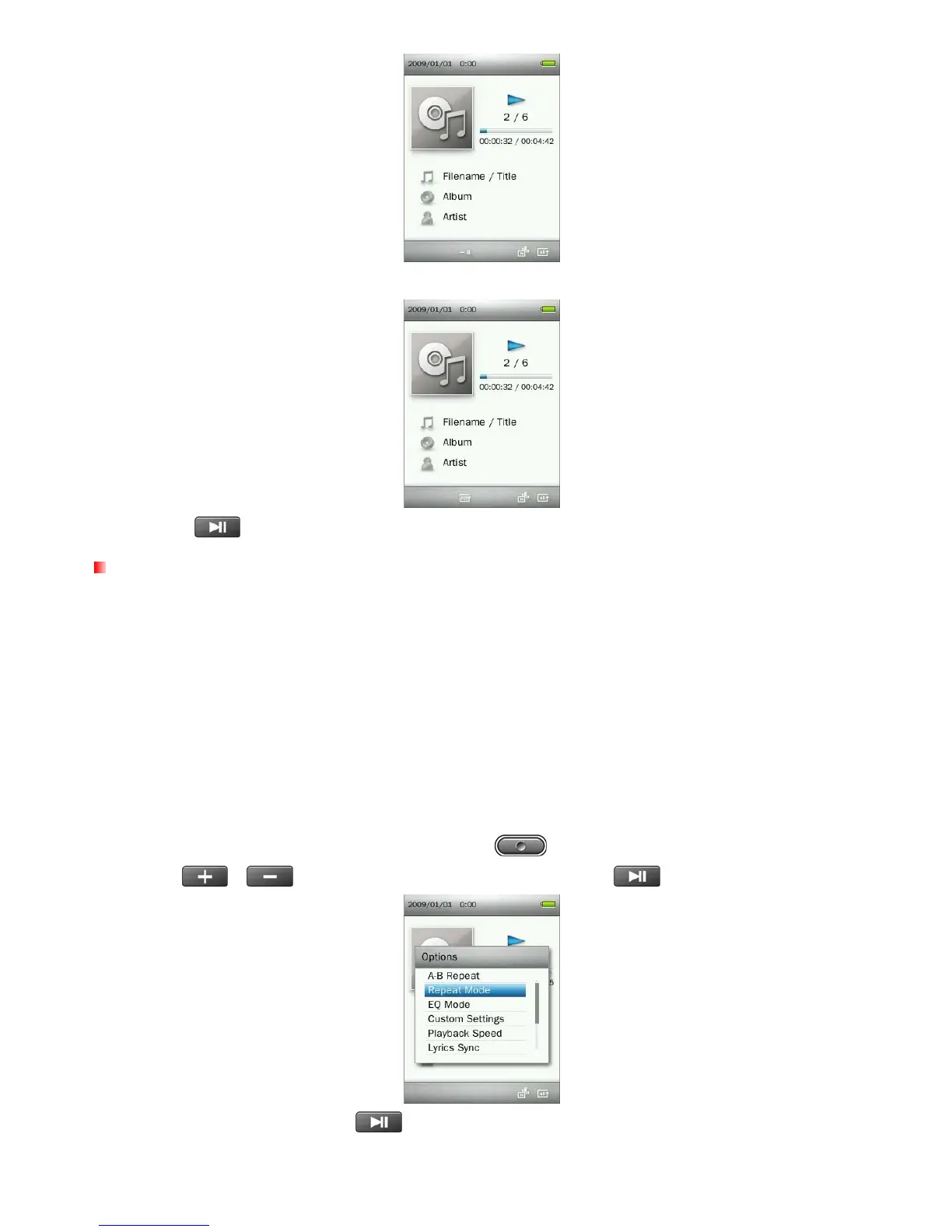 Repeat All (continuously repeats playback of all music files available, in consecutive order)