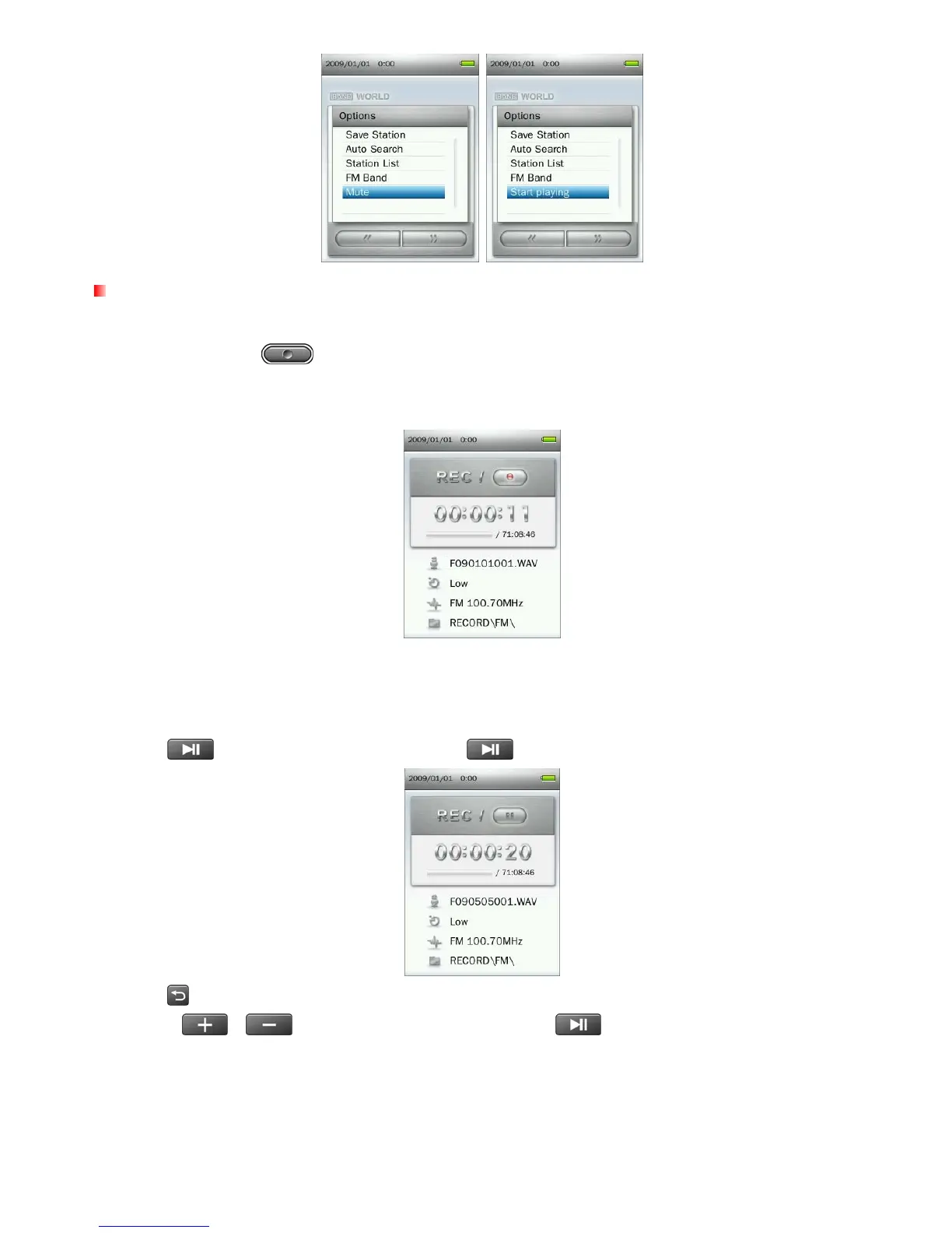 3. An automatically generated file name for your recording, along with the current record quality, FM frequency,