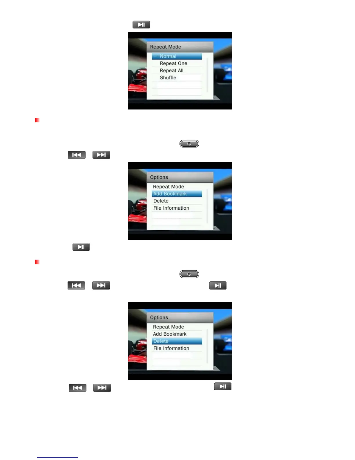 1. While viewing a file in the VIDEO mode, press the button to open the Options menu.