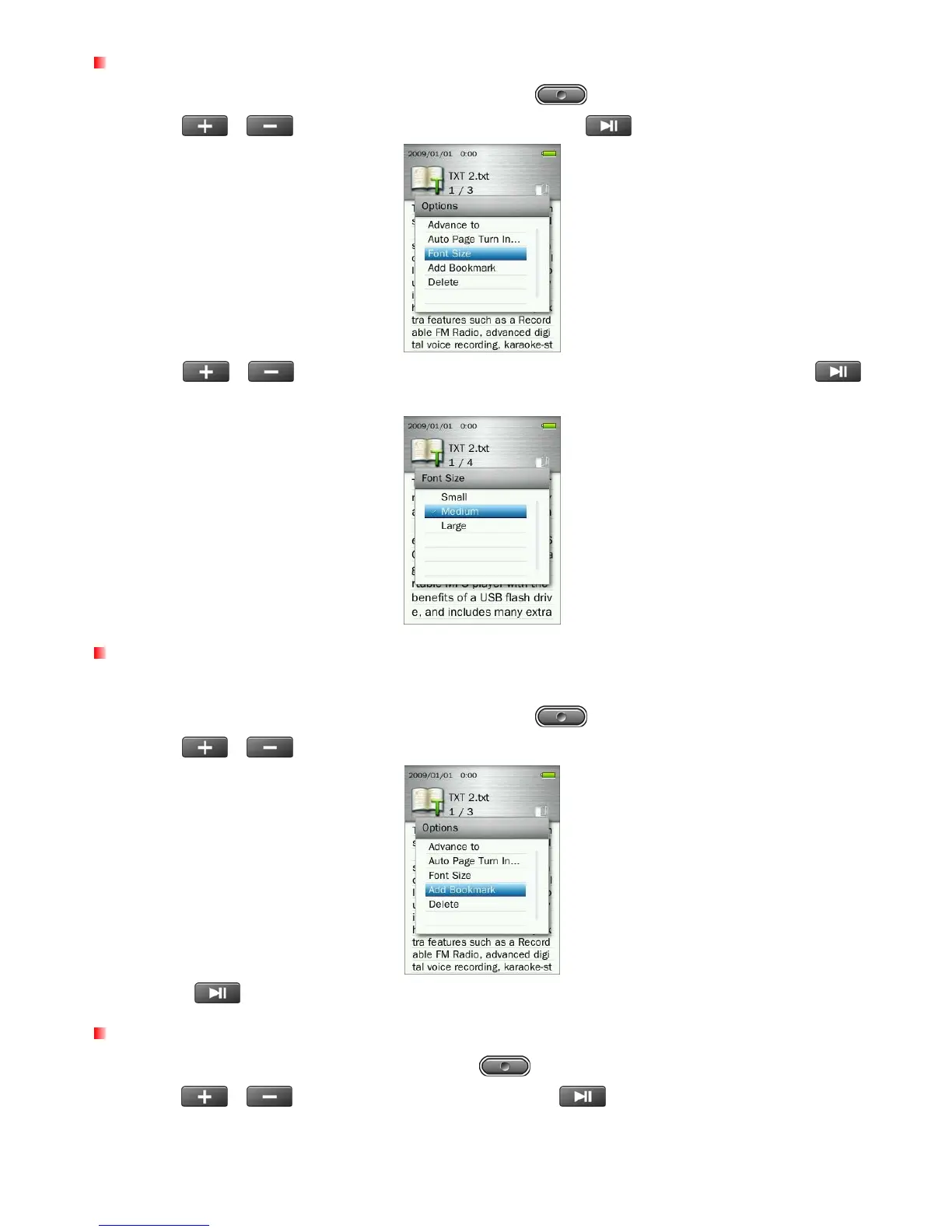 1. While reading a text file in the E-BOOKS mode, press the button to open the Options menu.