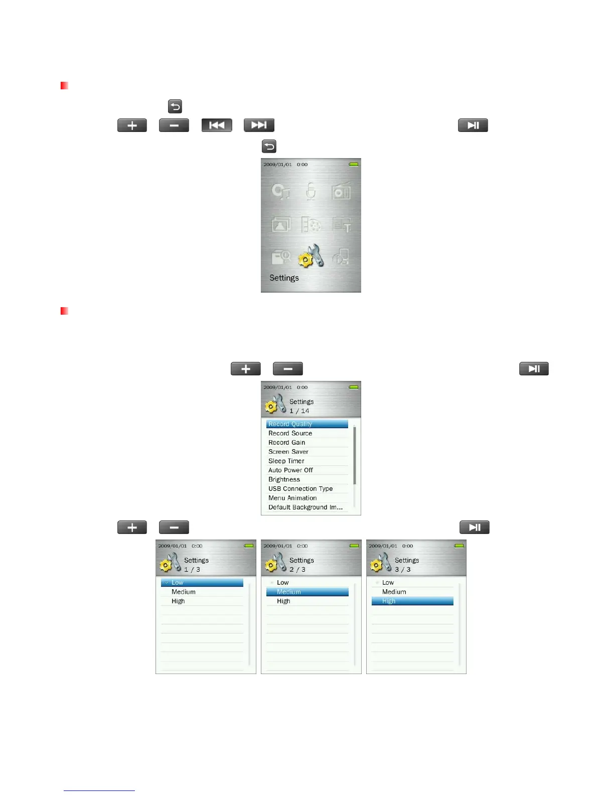 buttons to select Low, Medium, or High quality and press