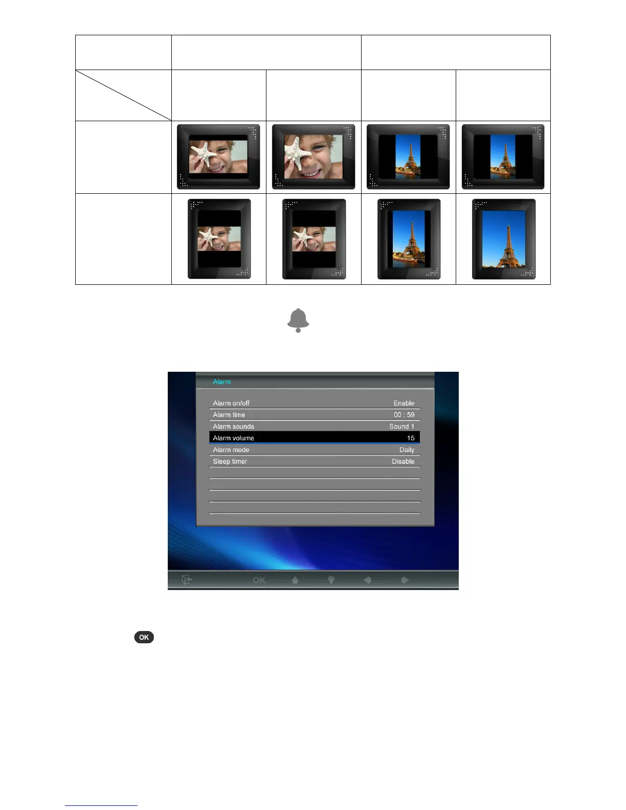 • Alarm Time: Press LEFT or RIGHT to switch between hour and minute, and UP or DOWN
