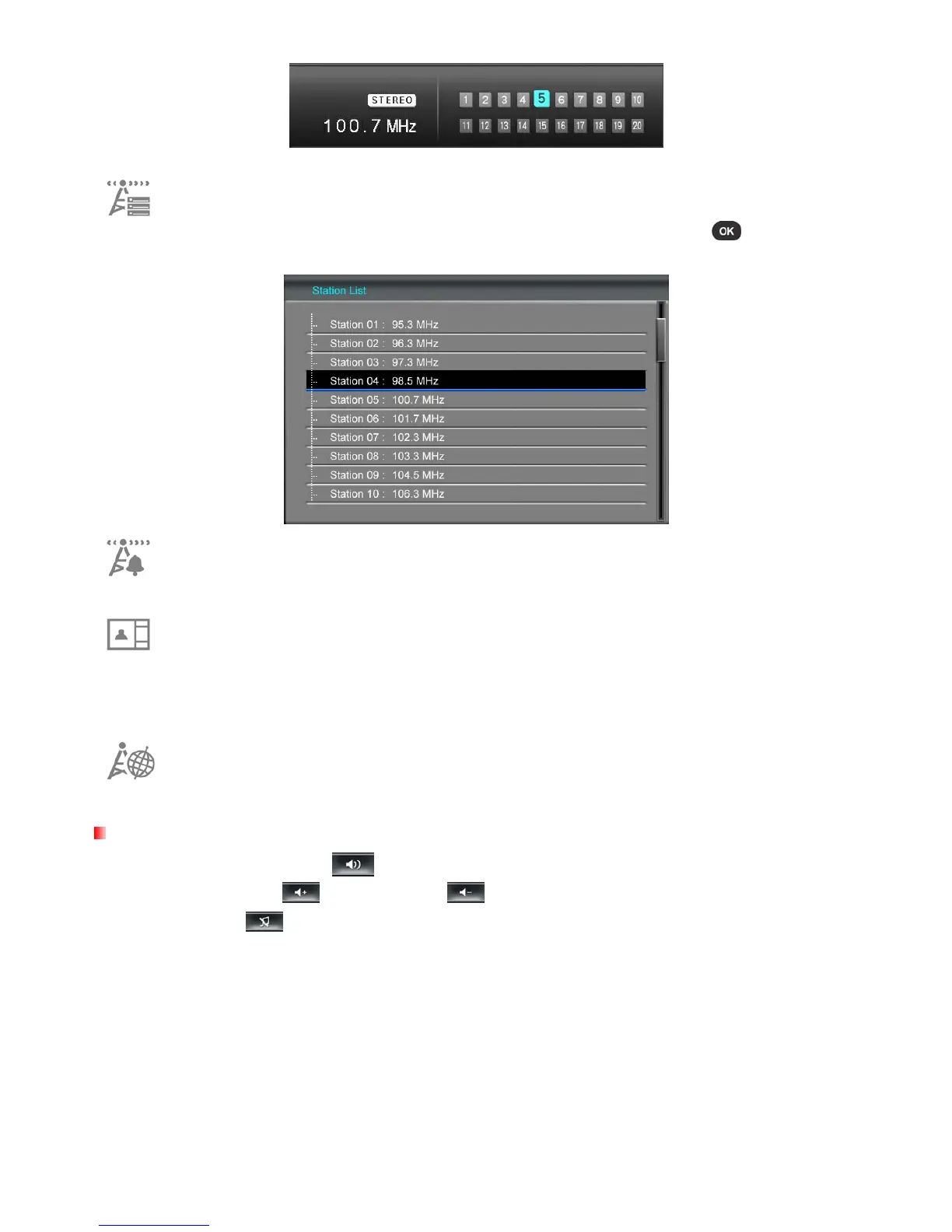Station List: This option displays a list of all 20 preset stations and their frequencies. Use the UP /