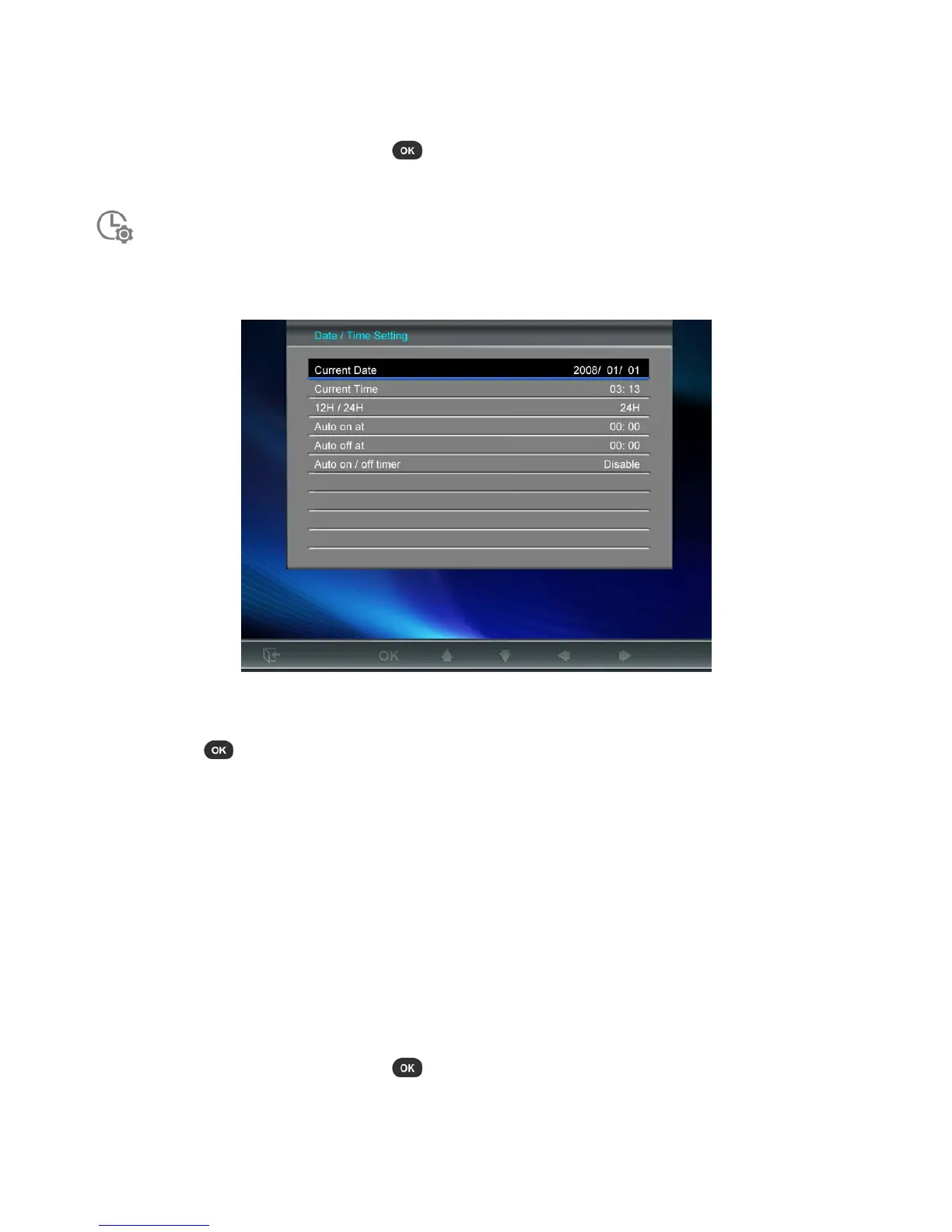 • Current Date: Press LEFT or RIGHT to select between year month or day, and press UP /