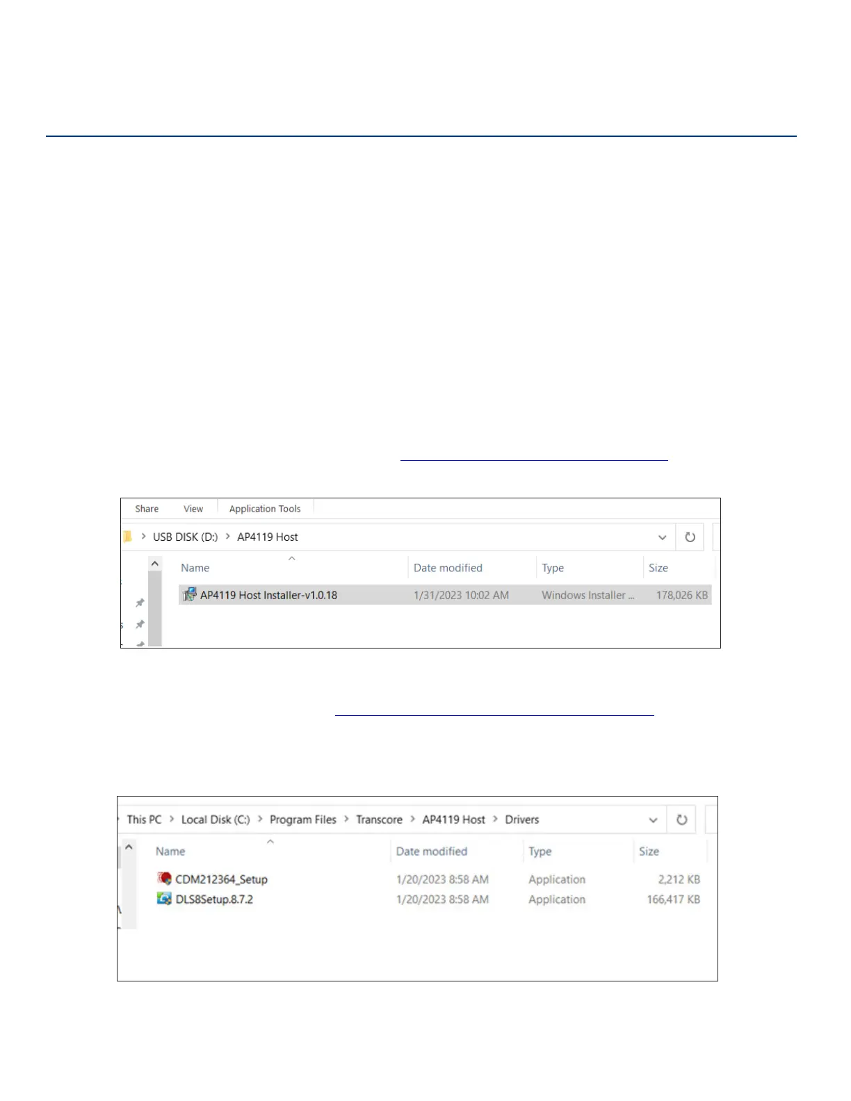 Drivers are located on the PC in C:\Program Files\Transcore\AP4119 Host\Drivers.